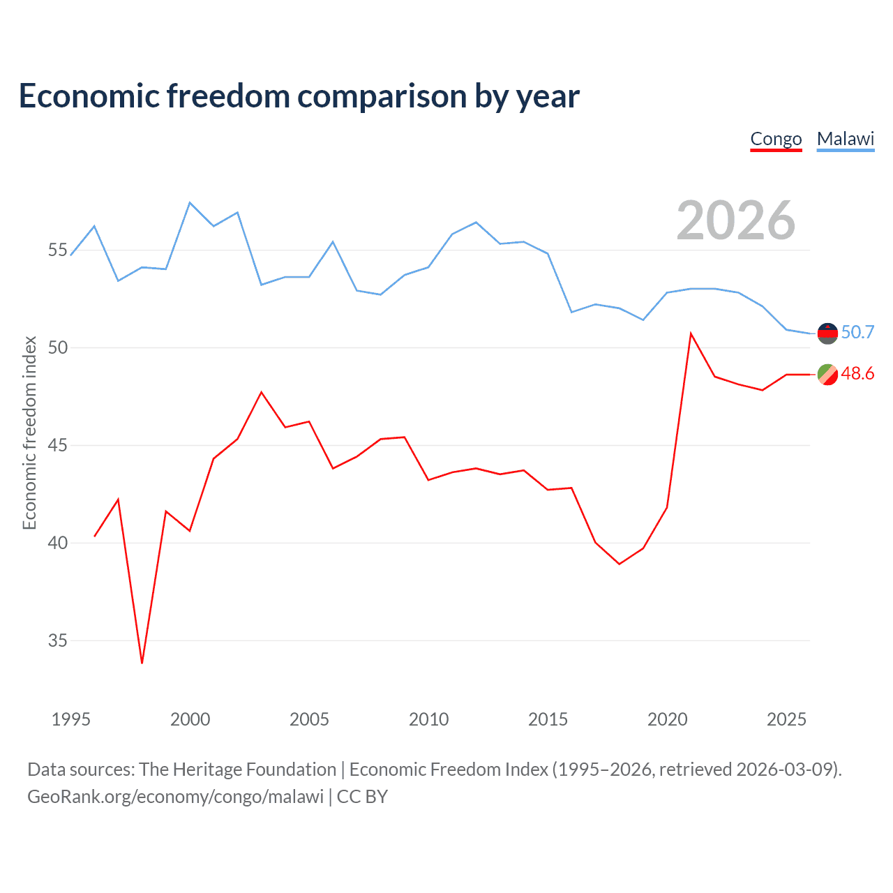 The Economic Freedom Index for the Congo is 48.6, ranking 169/197, compared to 50.7 for Malawi, ranking 159/197. The chart above displays a comparison of annual changes in economic freedom indexes.
