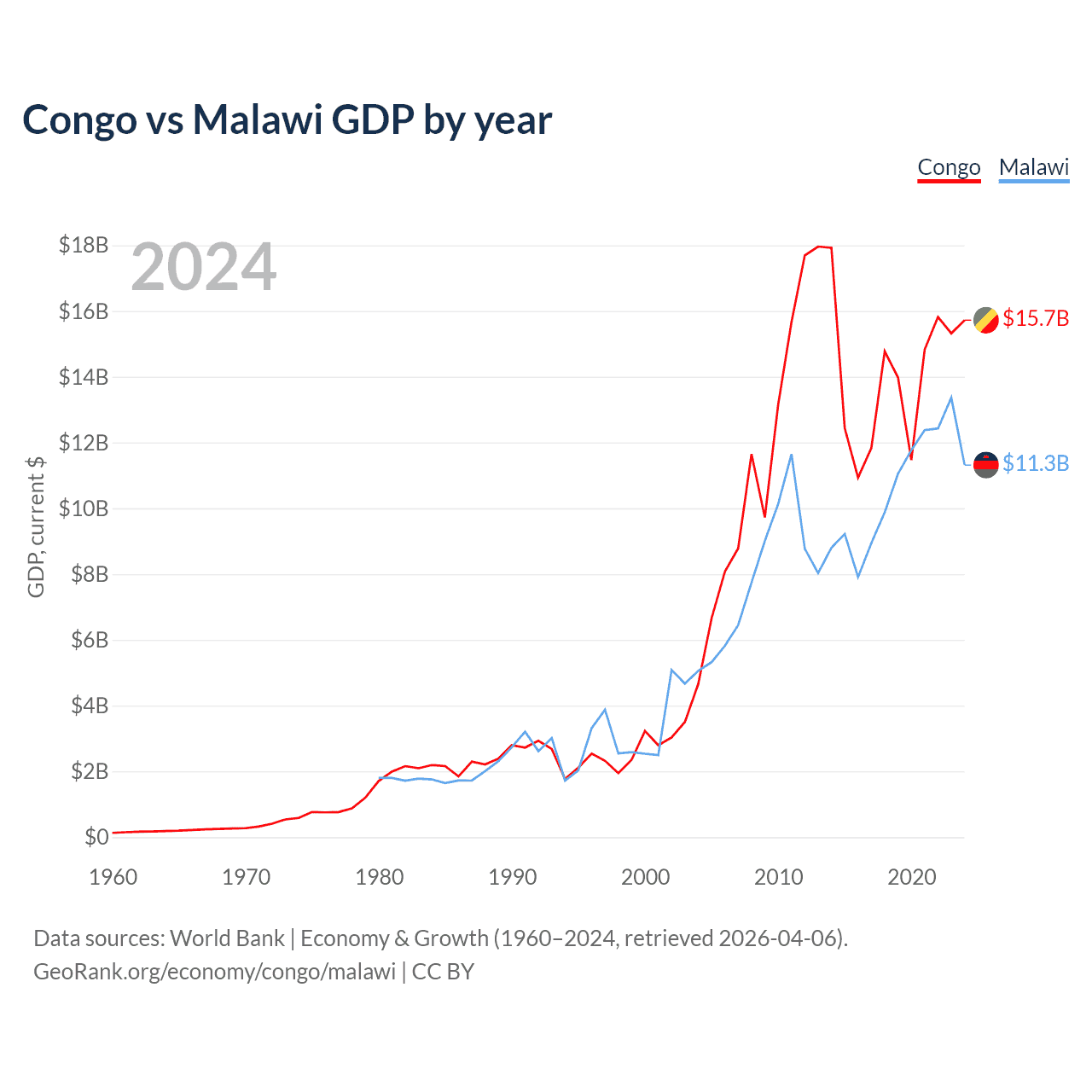 Congo vs Malawi GDP by year