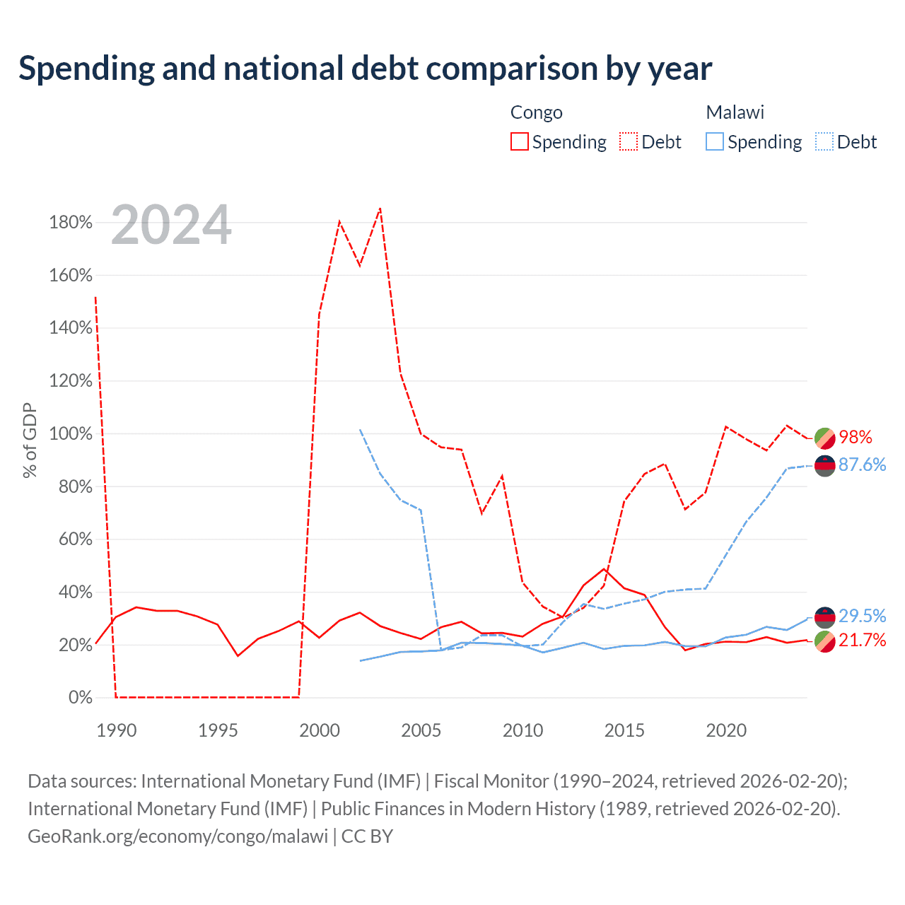 The Congo has $15.4B in government debt (98% of GDP), compared to $9.91B (87.6% of GDP) in Malawi.