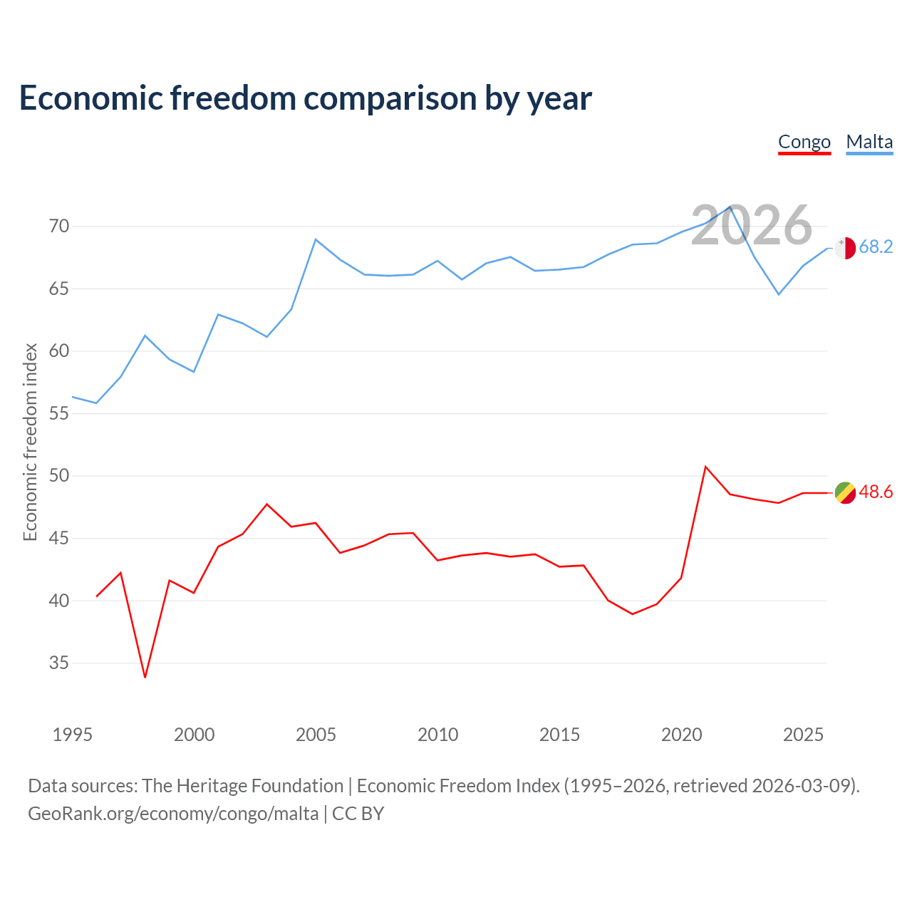 The Economic Freedom Index for the Congo is 48.6, ranking 169/197, compared to 68.2 for Malta, ranking 49/197. The chart above displays a comparison of annual changes in economic freedom indexes.