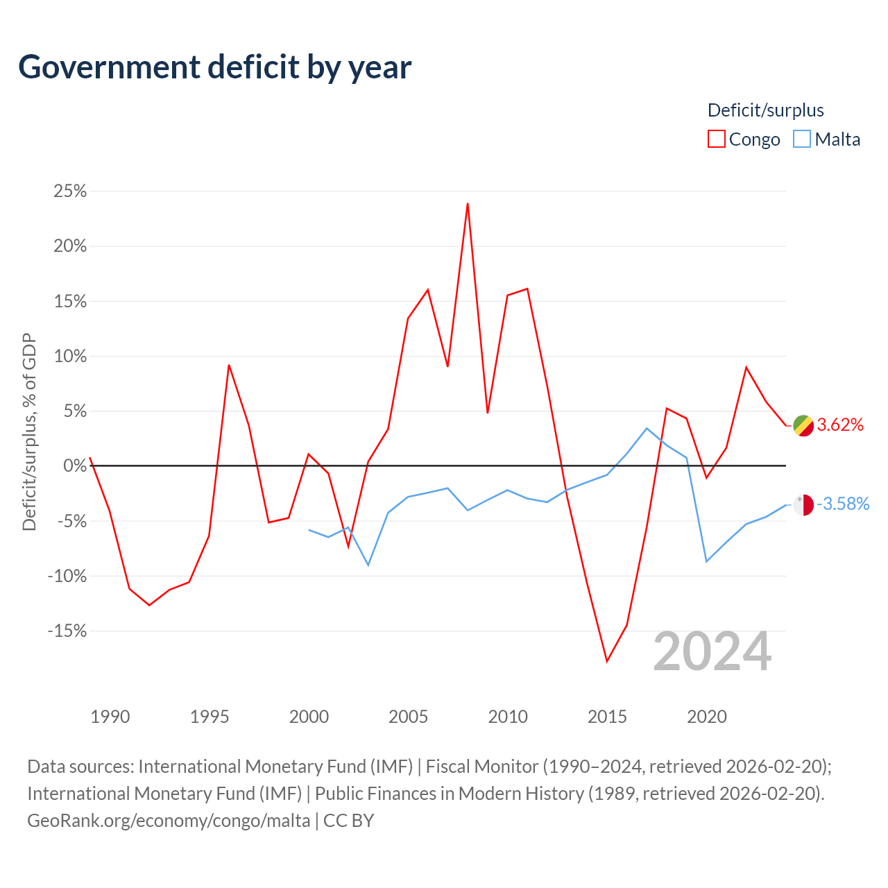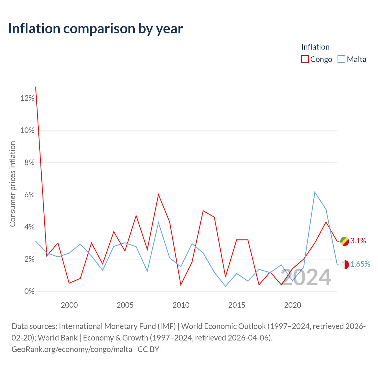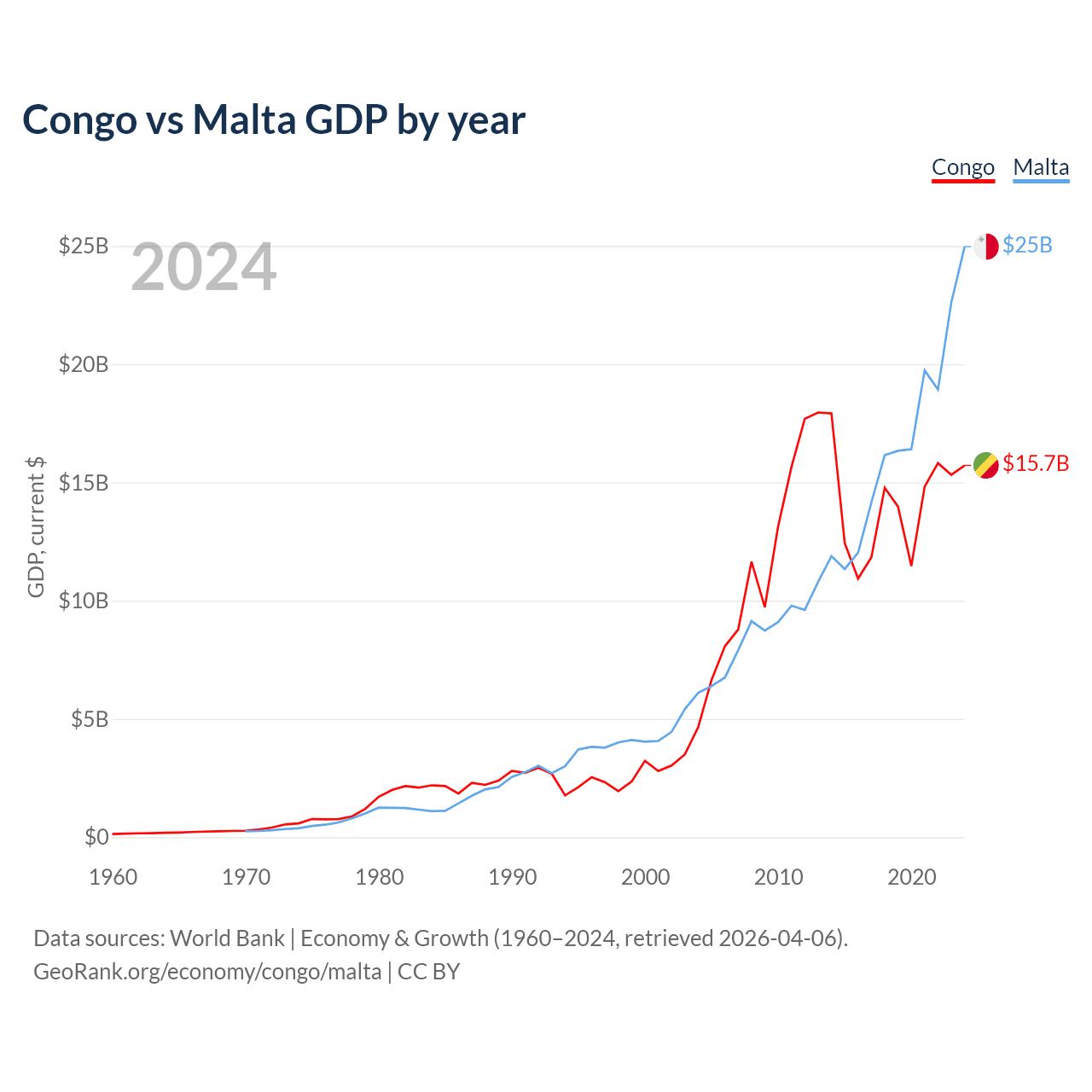 The Congo has a GDP of $15.7B compared to $25B for Malta, ranking 141/197 and 119/197 by economy size, respectively.