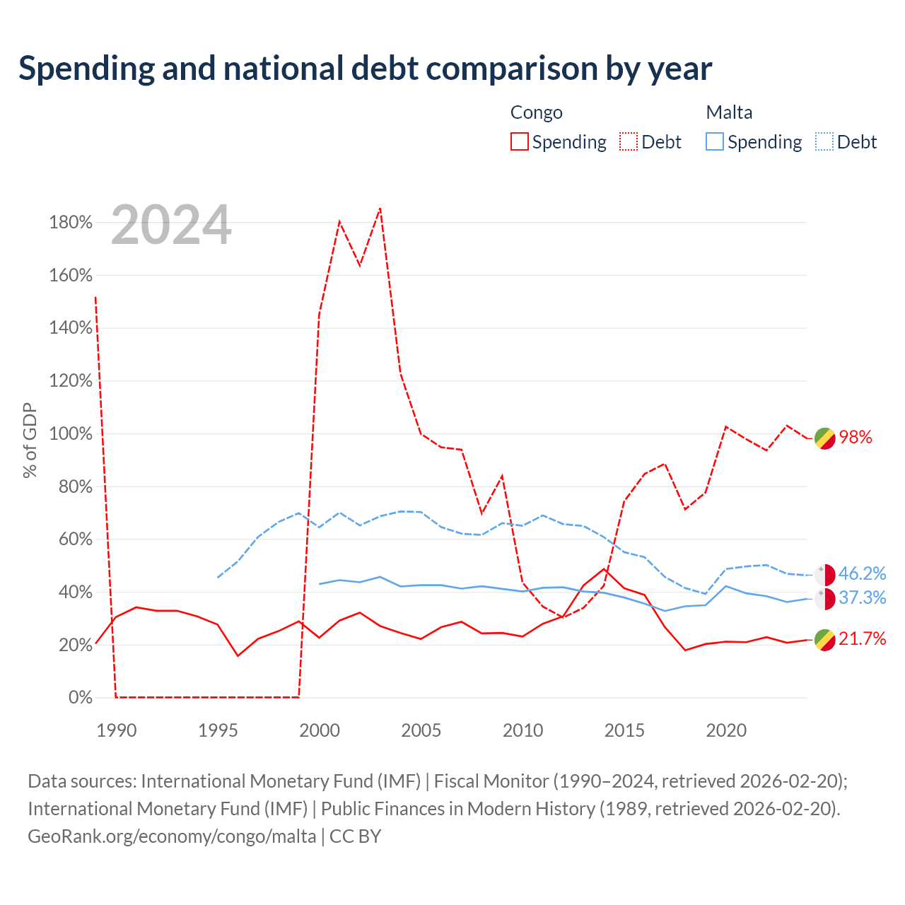 The Congo has $15.4B in government debt (98% of GDP), compared to $11.5B (46.2% of GDP) in Malta.