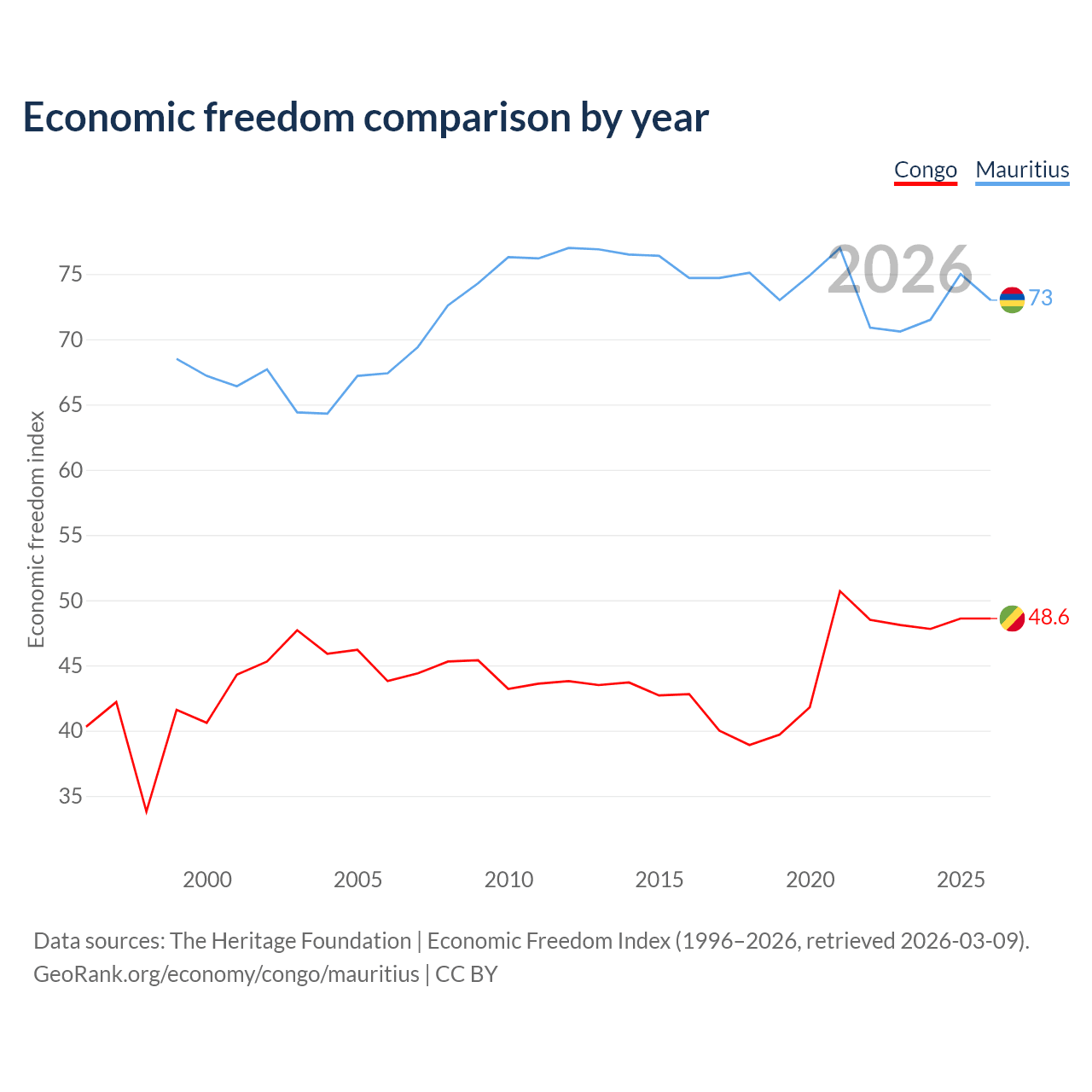 The Economic Freedom Index for the Congo is 48.6, ranking 169/197, compared to 73 for Mauritius, ranking 26/197. The chart above displays a comparison of annual changes in economic freedom indexes.