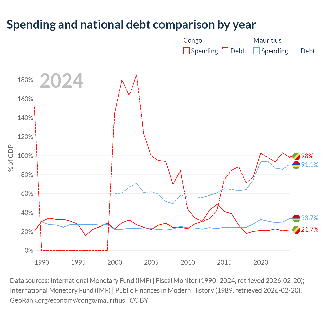 The Congo has $15.4B in government debt (98% of GDP), compared to $13.6B (91.1% of GDP) in Mauritius.
