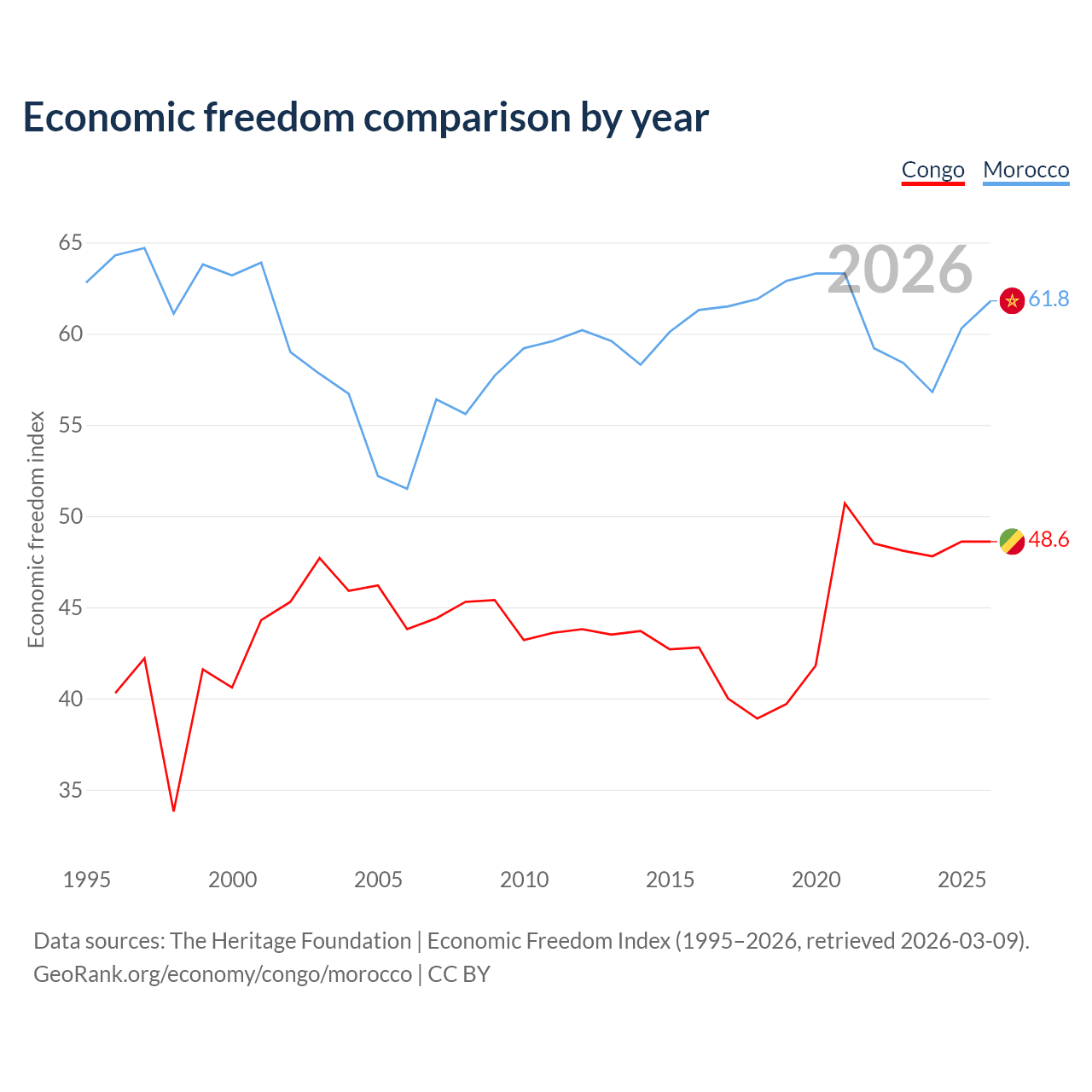 The Economic Freedom Index for the Congo is 48.6, ranking 169/197, compared to 61.8 for Morocco, ranking 91/197. The chart above displays a comparison of annual changes in economic freedom indexes.