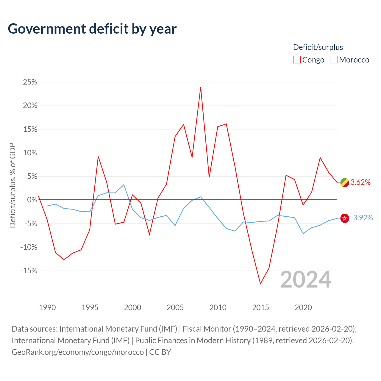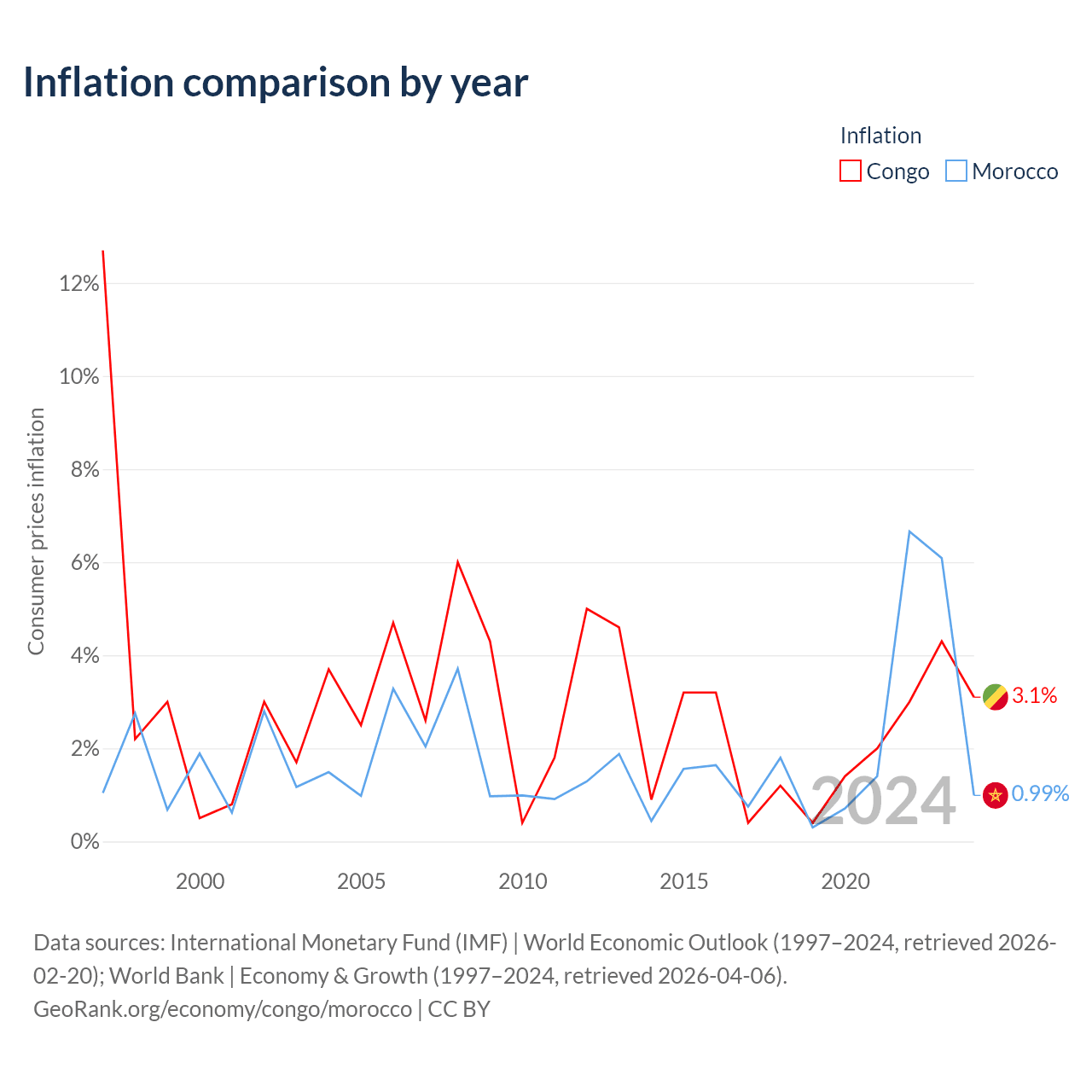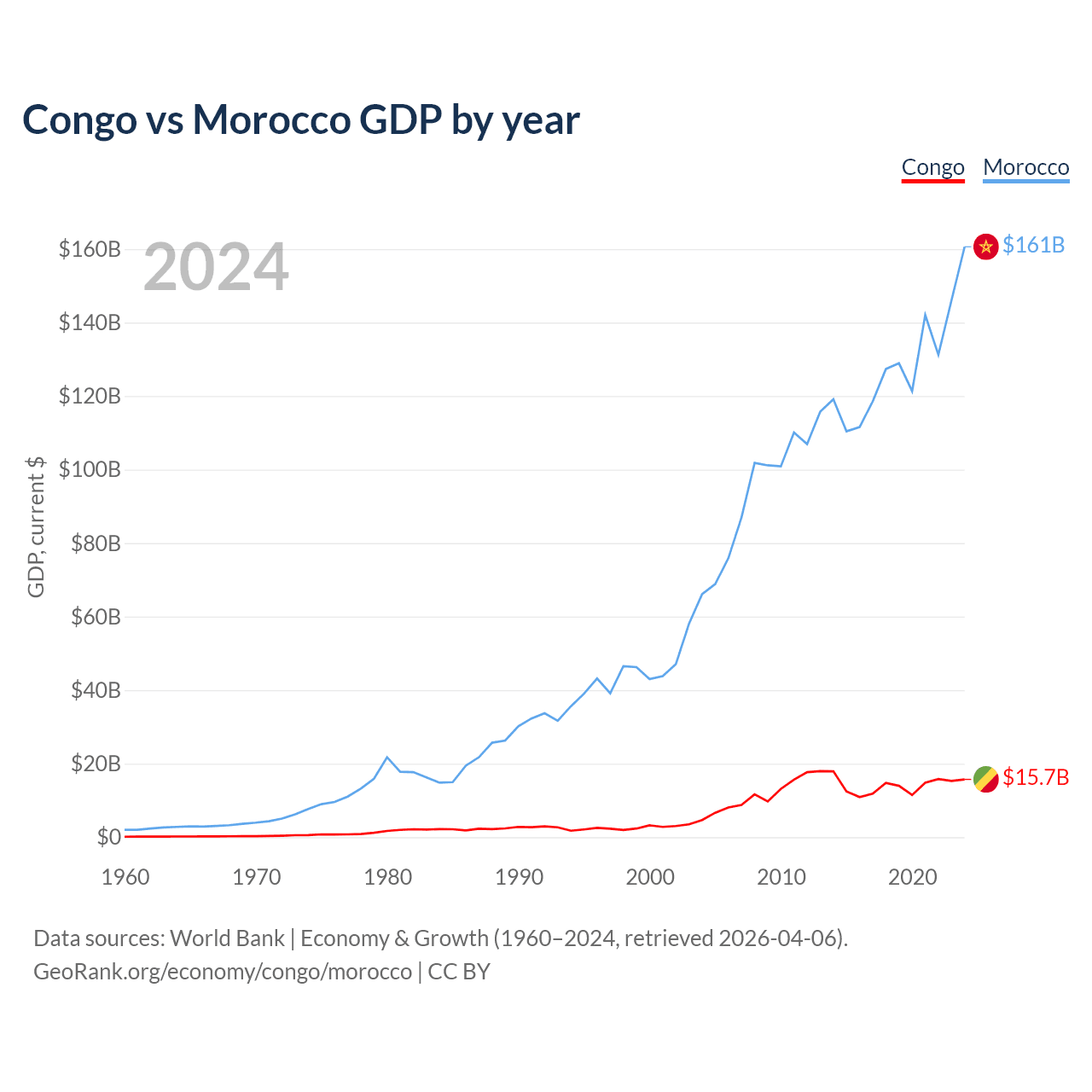 The Congo has a GDP of $15.7B compared to $161B for Morocco, ranking 141/197 and 58/197 by economy size, respectively.