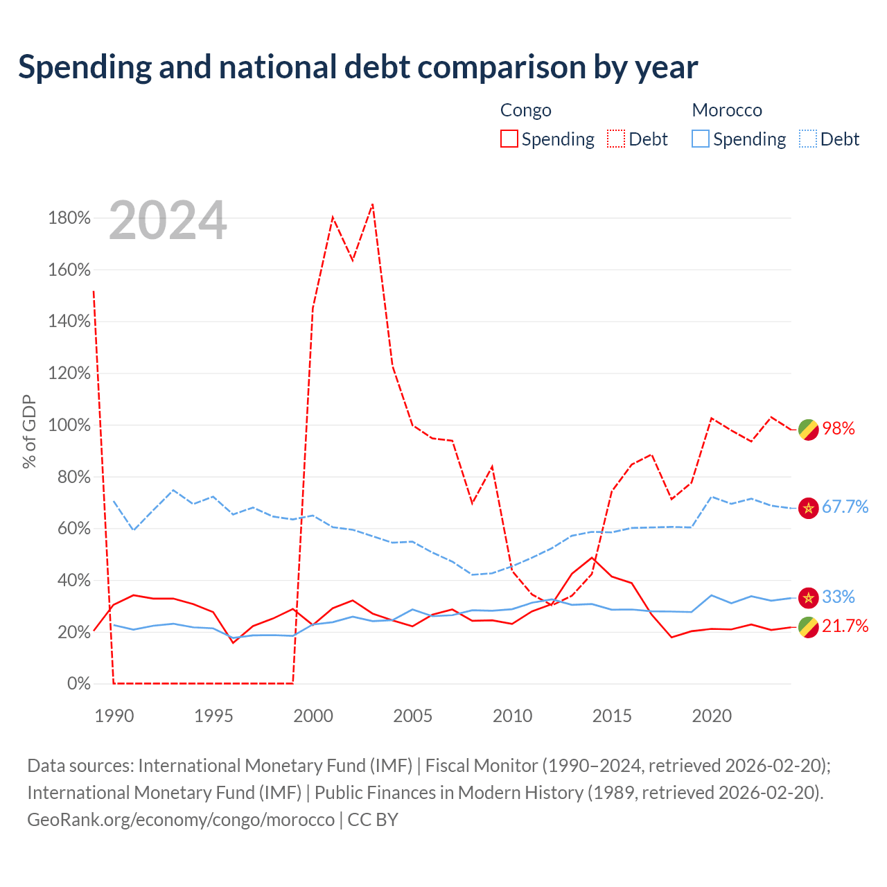 The Congo has $15.4B in government debt (98% of GDP), compared to $109B (67.7% of GDP) in Morocco.