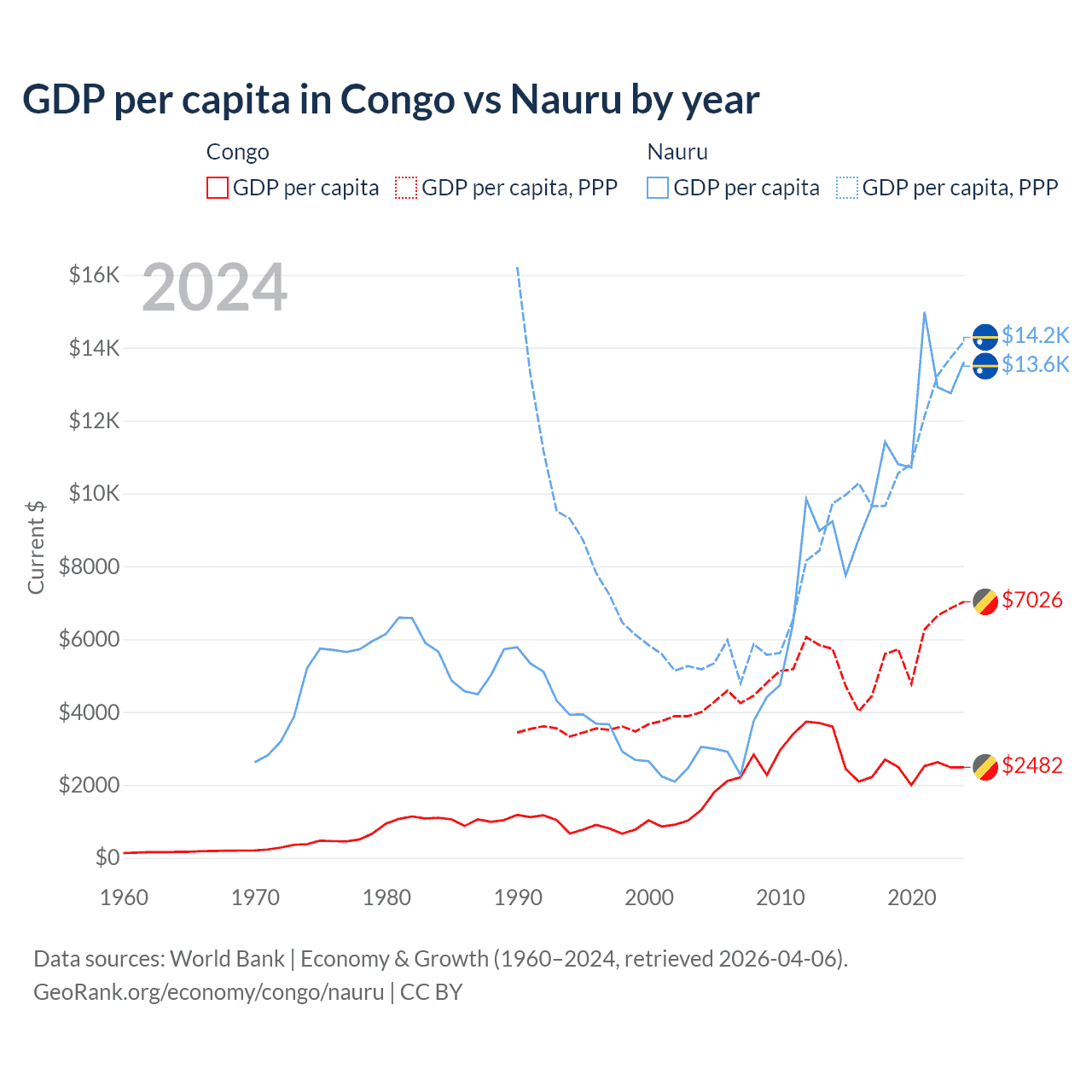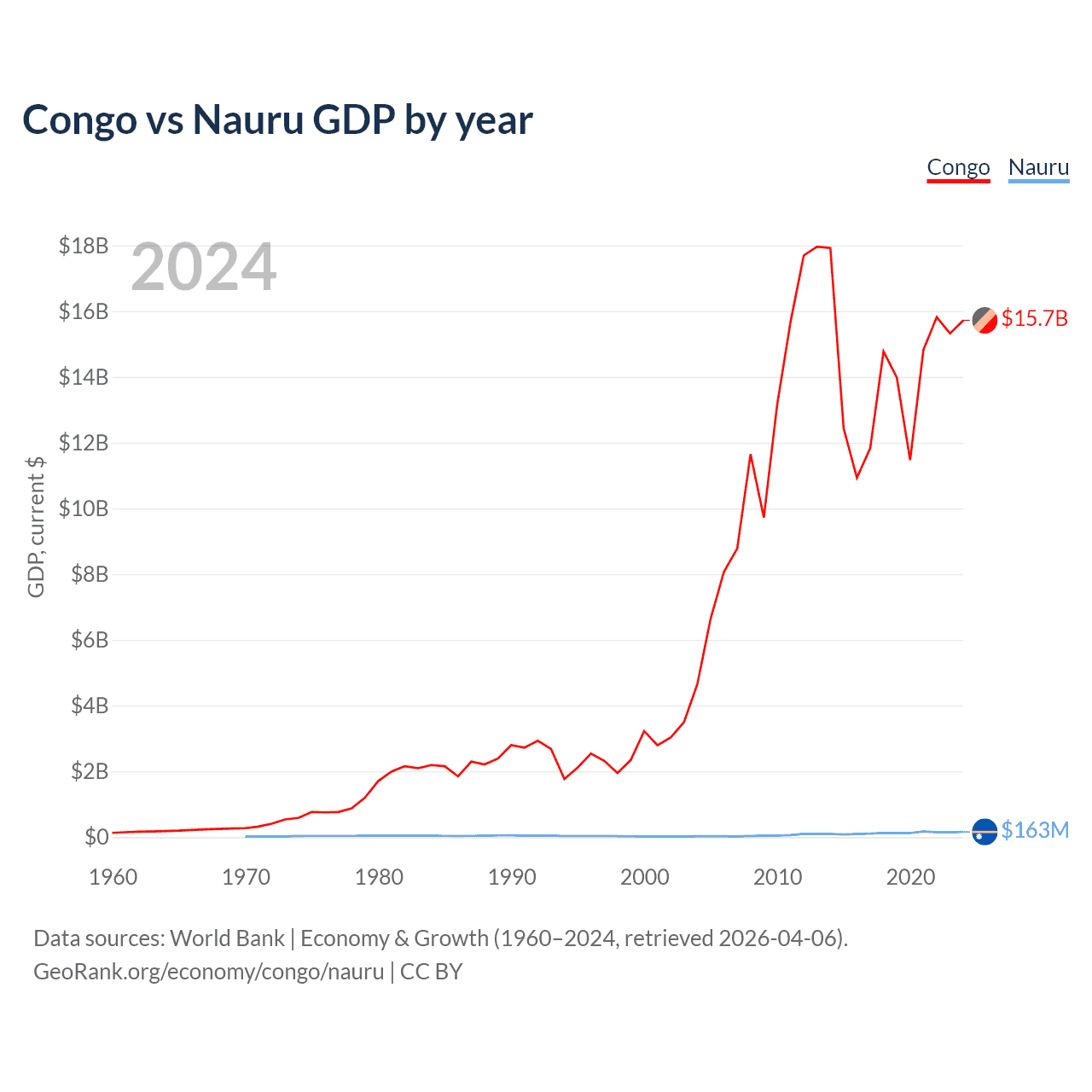 The Congo has a GDP of $15.7B compared to $163M for Nauru, ranking 141/197 and 195/197 by economy size, respectively.