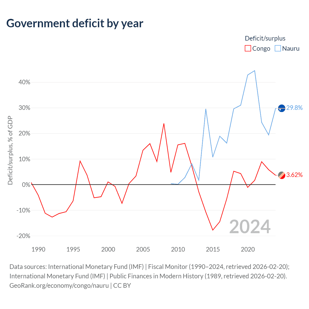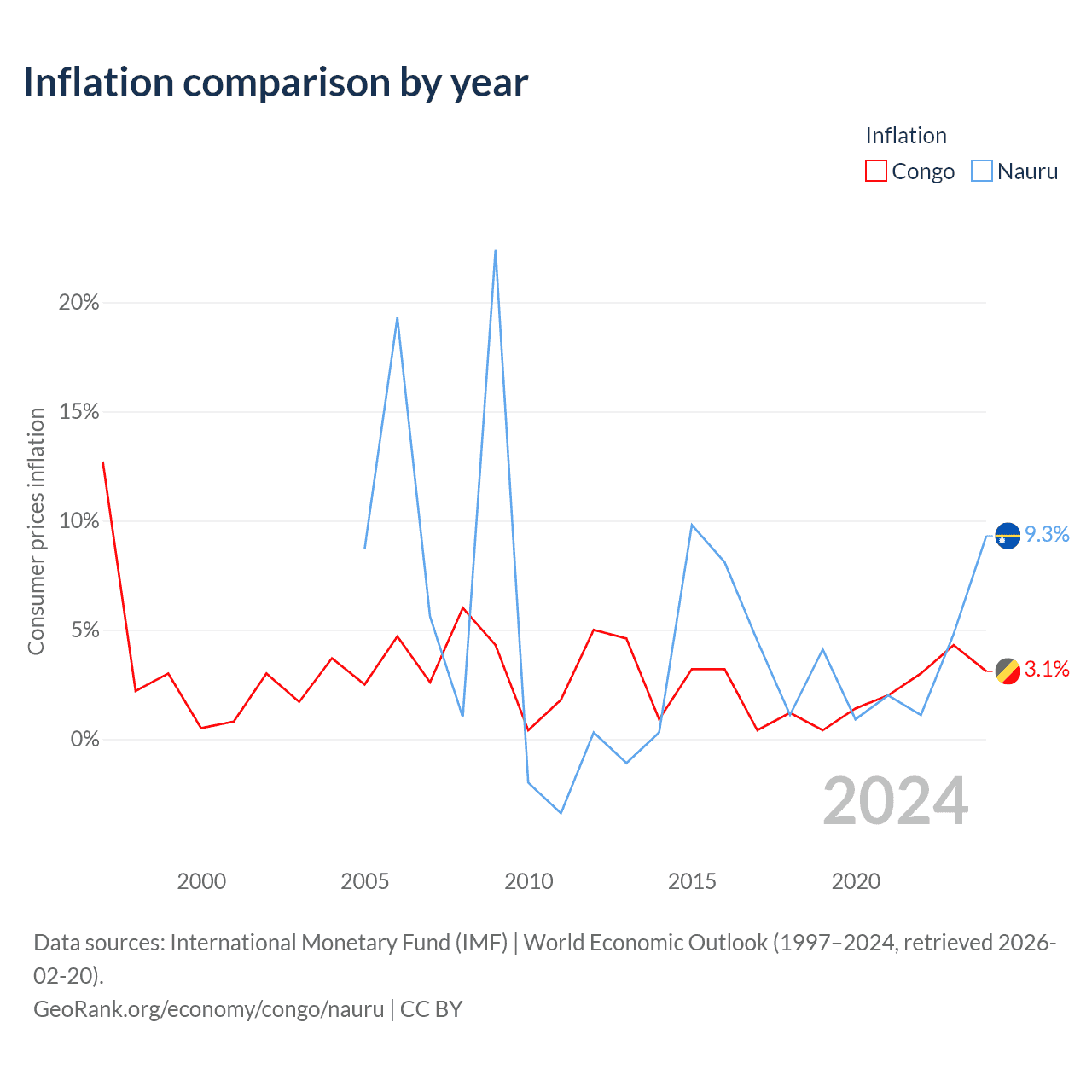 Over the past 20 years, the Congo has recorded an average annual inflation rate of 2.75%, compared with 4.84% in Nauru. In 2024, inflation was 3.1% in the Congo and 9.3% in Nauru.