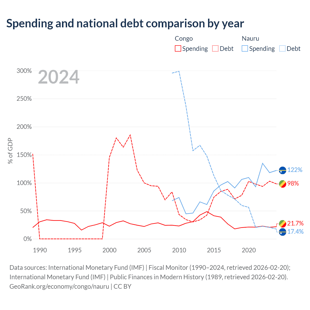 The Congo has $15.4B in government debt (98% of GDP), compared to $28.3M (17.4% of GDP) in Nauru.