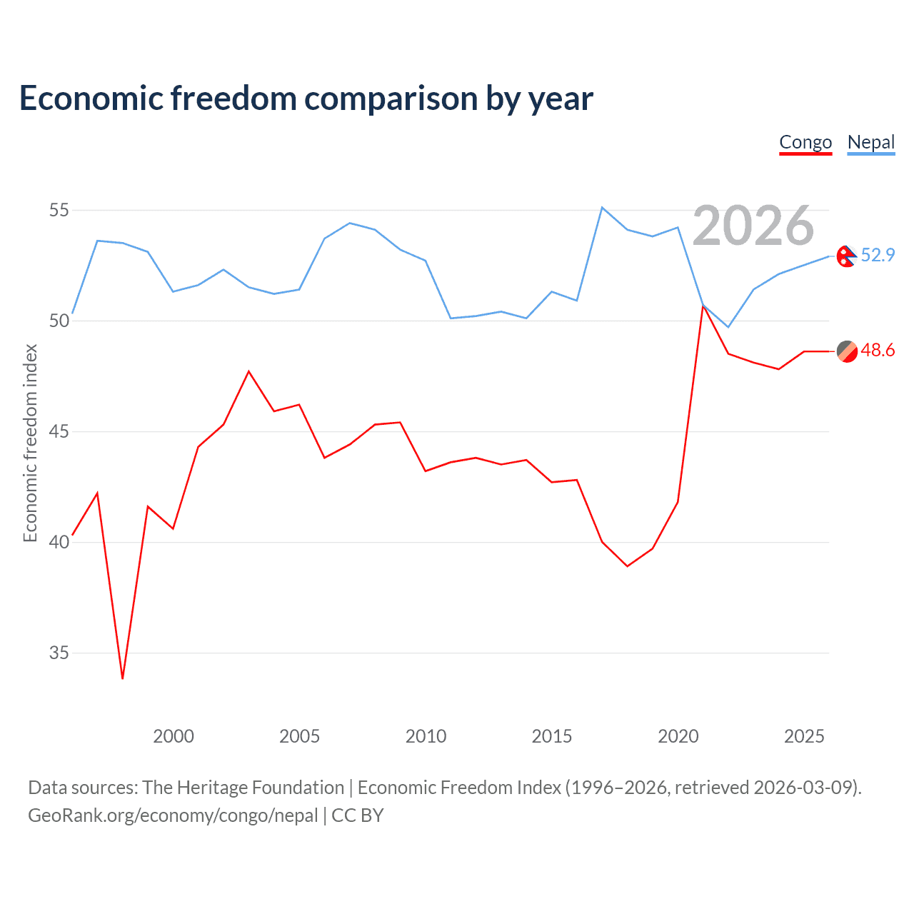 The Economic Freedom Index for the Congo is 48.6, ranking 169/197, compared to 52.9 for Nepal, ranking 144/197. The chart above displays a comparison of annual changes in economic freedom indexes.