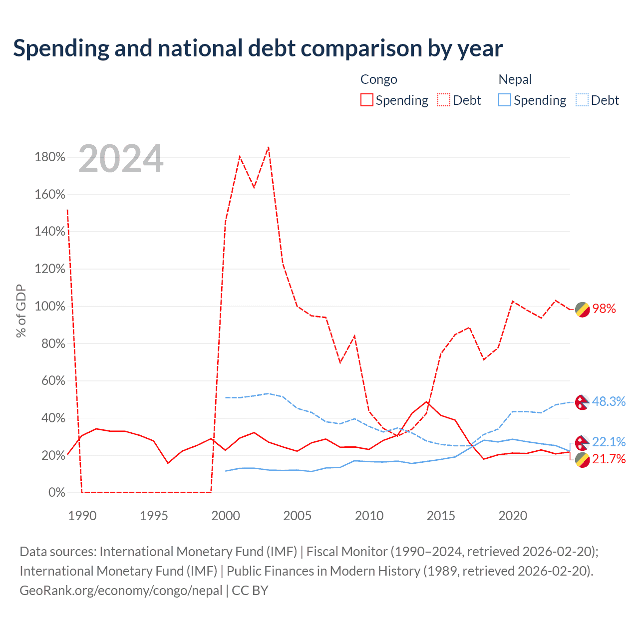 The Congo has $15.4B in government debt (98% of GDP), compared to $20.7B (48.3% of GDP) in Nepal.