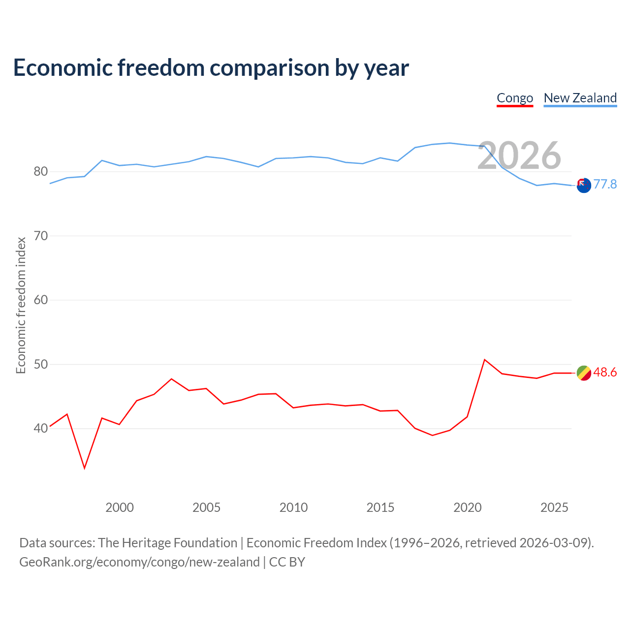 The Economic Freedom Index for the Congo is 48.6, ranking 169/197, compared to 77.8 for New Zealand, ranking 13/197. The chart above displays a comparison of annual changes in economic freedom indexes.