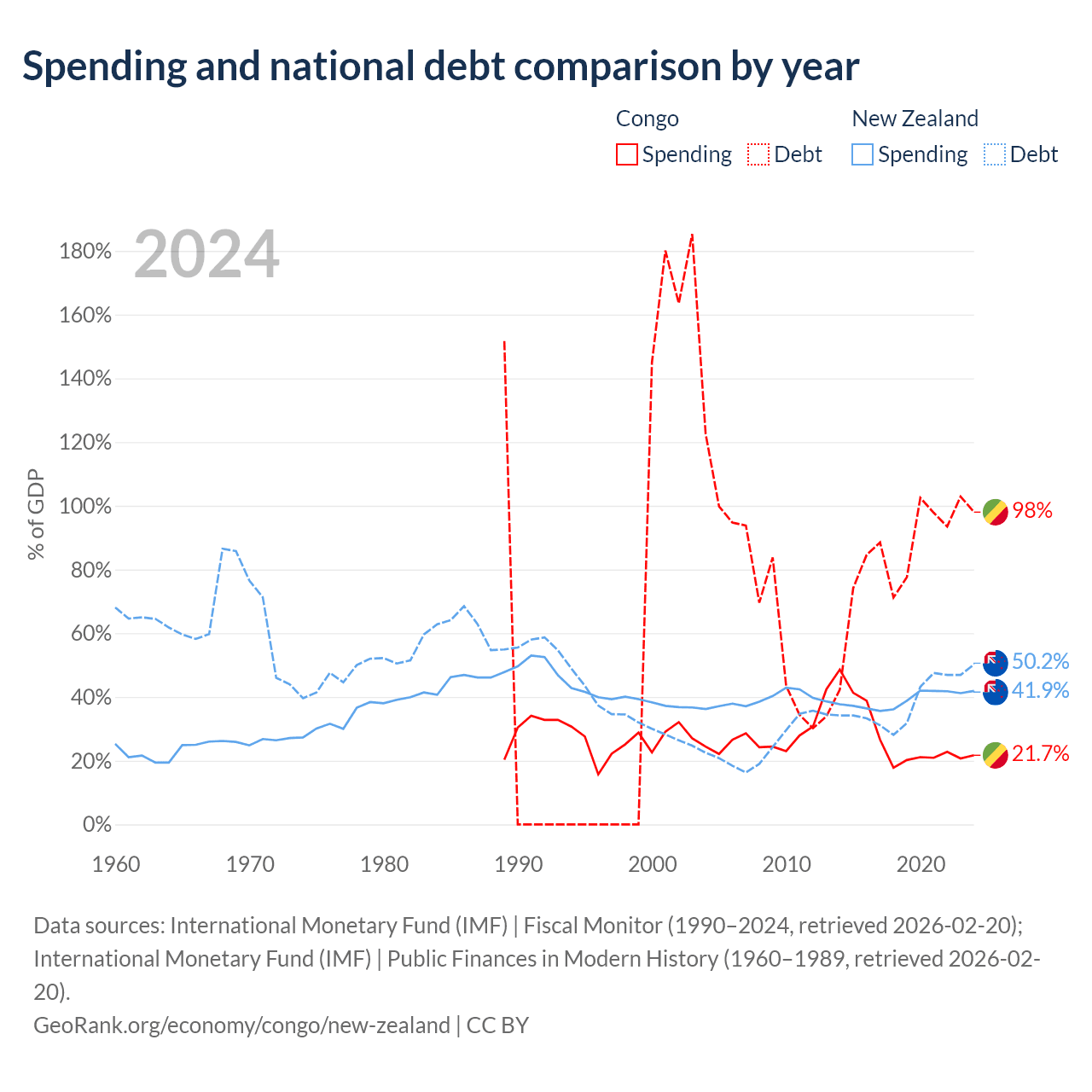 The Congo has $15.4B in government debt (98% of GDP), compared to $131B (50.2% of GDP) in New Zealand.