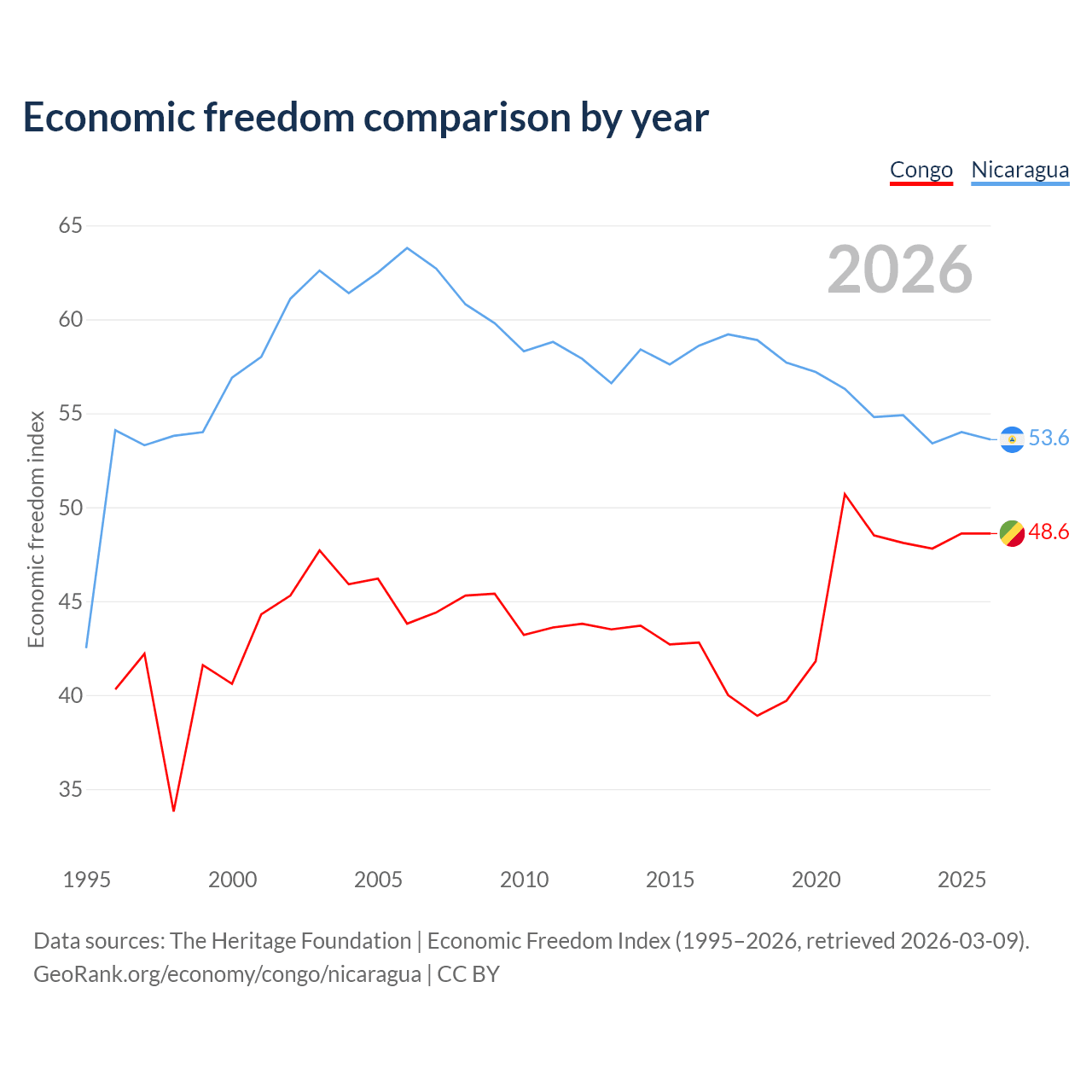 The Economic Freedom Index for the Congo is 48.6, ranking 169/197, compared to 53.6 for Nicaragua, ranking 139/197. The chart above displays a comparison of annual changes in economic freedom indexes.