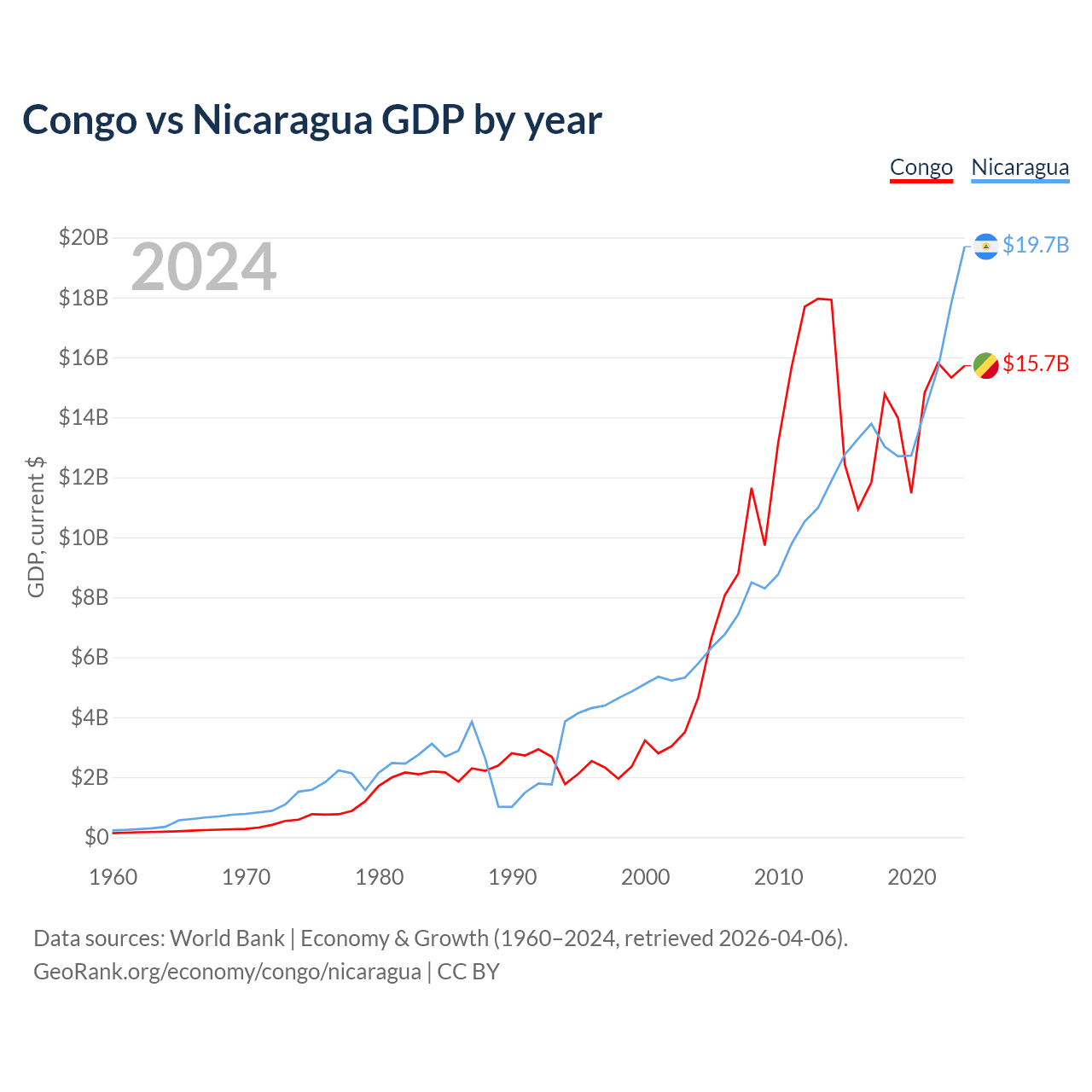 The Congo has a GDP of $15.7B compared to $19.7B for Nicaragua, ranking 141/197 and 131/197 by economy size, respectively.