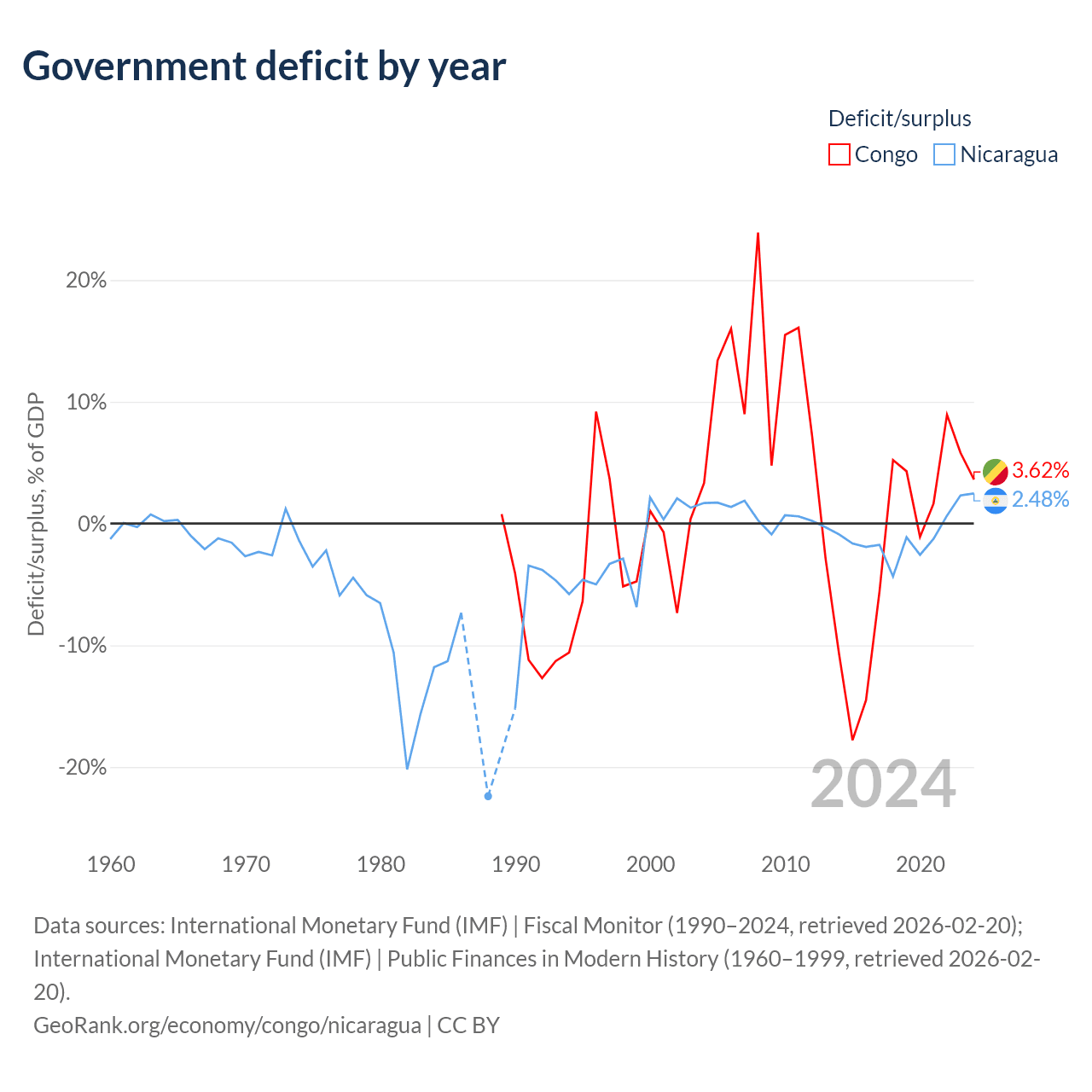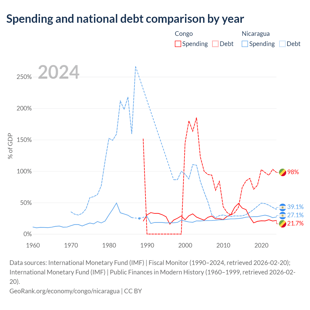 The Congo has $15.4B in government debt (98% of GDP), compared to $7.71B (39.1% of GDP) in Nicaragua.