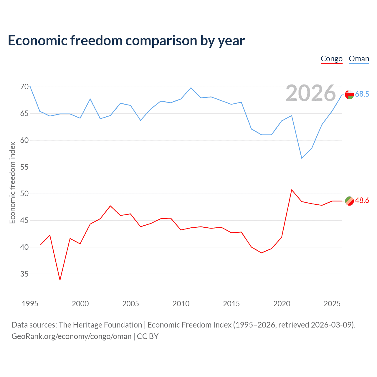 The Economic Freedom Index for the Congo is 48.6, ranking 169/197, compared to 68.5 for Oman, ranking 45/197. The chart above displays a comparison of annual changes in economic freedom indexes.