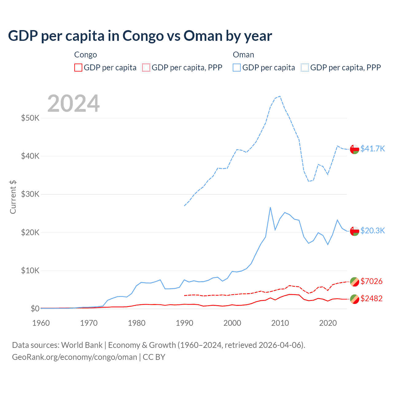 GDP per capita in Congo vs Oman by year