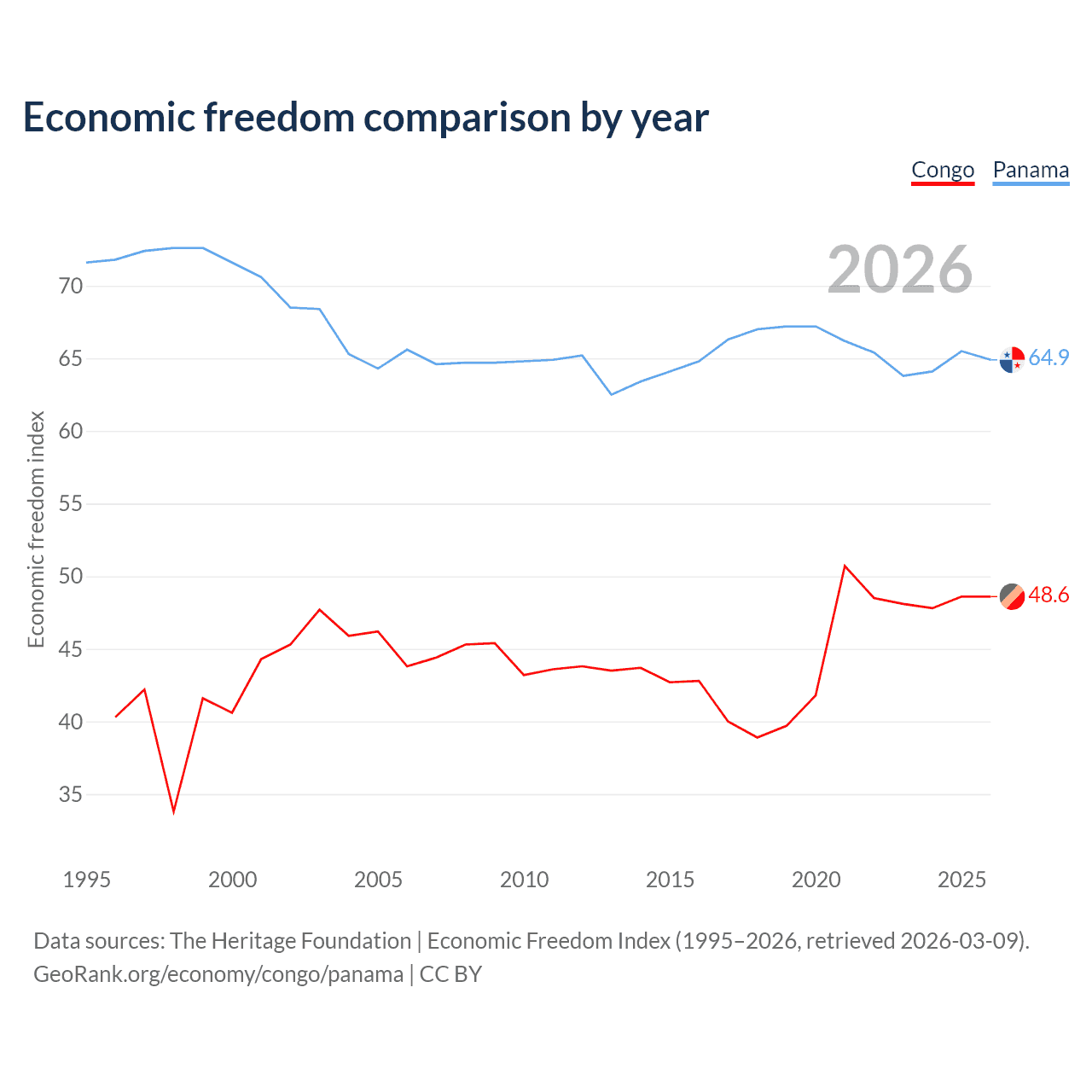 The Economic Freedom Index for the Congo is 48.6, ranking 169/197, compared to 64.9 for Panama, ranking 70/197. The chart above displays a comparison of annual changes in economic freedom indexes.