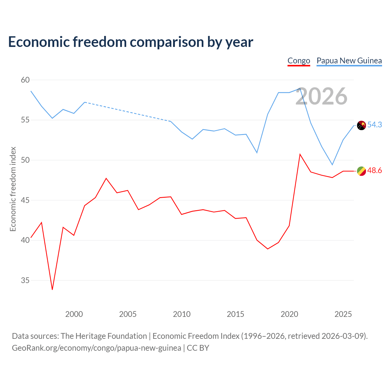 The Economic Freedom Index for the Congo is 48.6, ranking 169/197, compared to 54.3 for Papua New Guinea, ranking 134/197. The chart above displays a comparison of annual changes in economic freedom indexes.