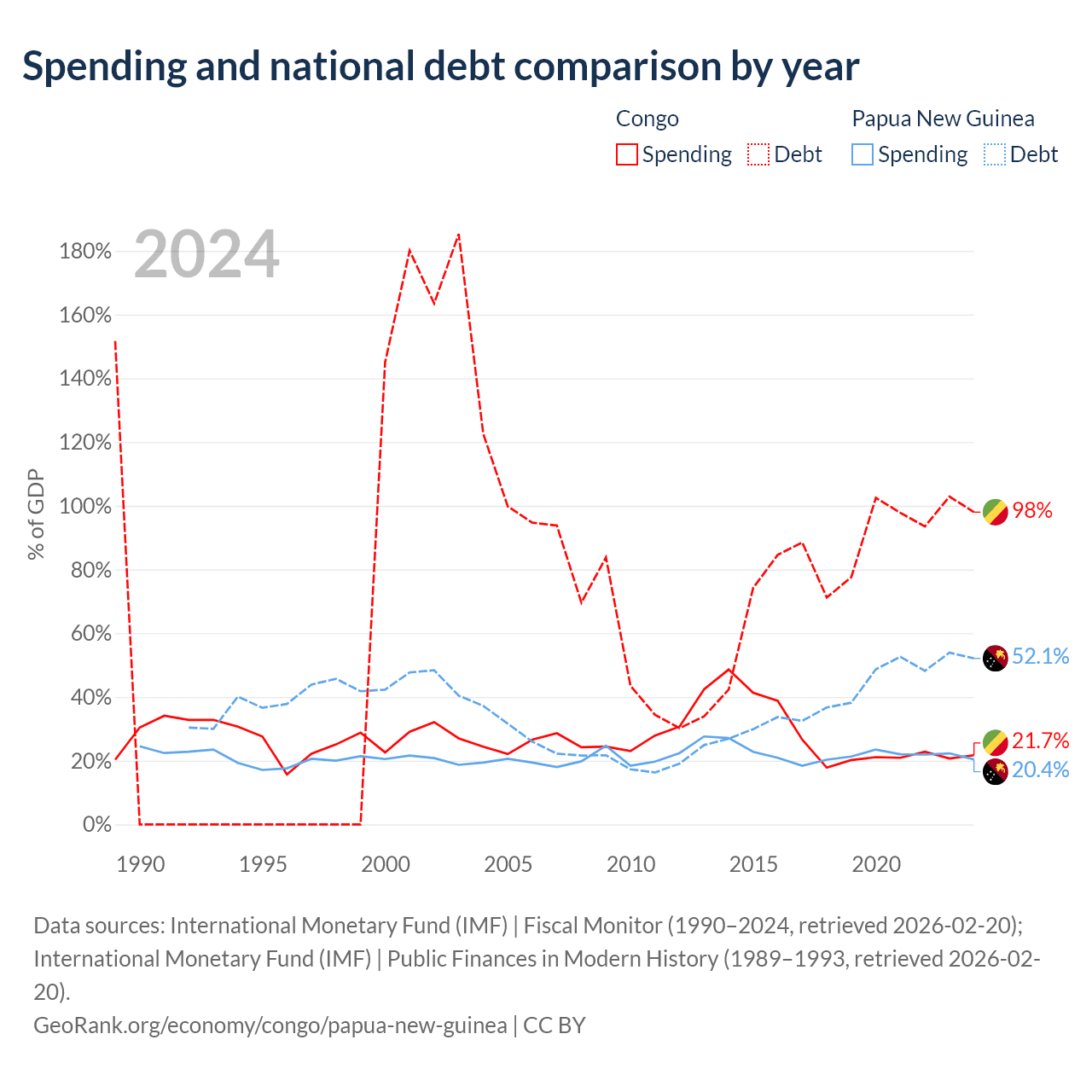 The Congo has $15.4B in government debt (98% of GDP), compared to $16.6B (52.1% of GDP) in Papua New Guinea.