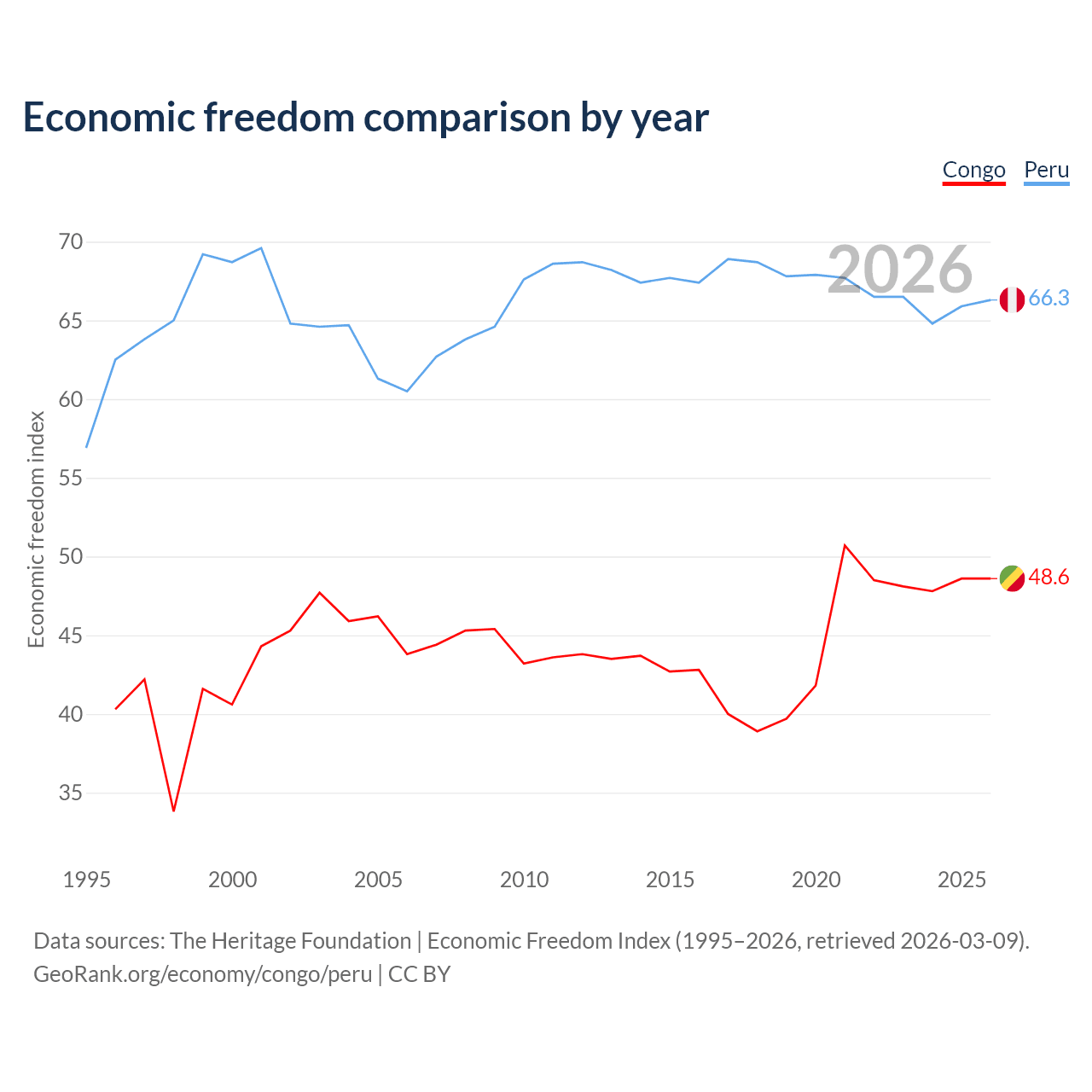 The Economic Freedom Index for the Congo is 48.6, ranking 169/197, compared to 66.3 for Peru, ranking 62/197. The chart above displays a comparison of annual changes in economic freedom indexes.