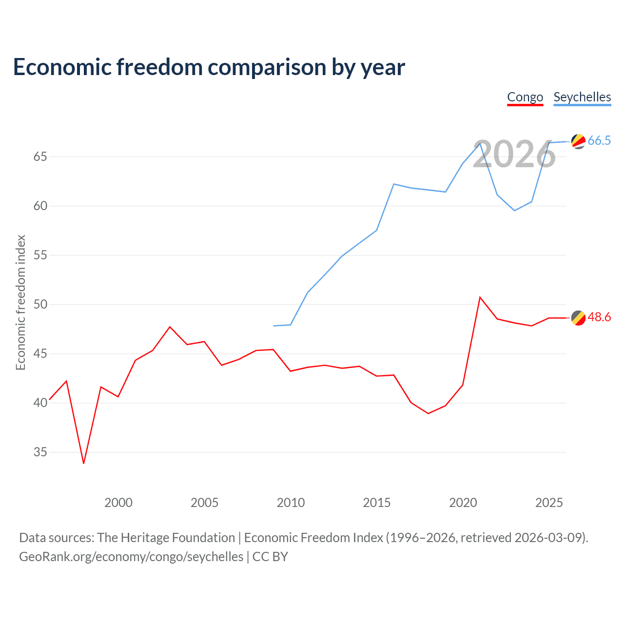 The Economic Freedom Index for the Congo is 48.6, ranking 169/197, compared to 66.5 for the Seychelles, ranking 60/197. The chart above displays a comparison of annual changes in economic freedom indexes.