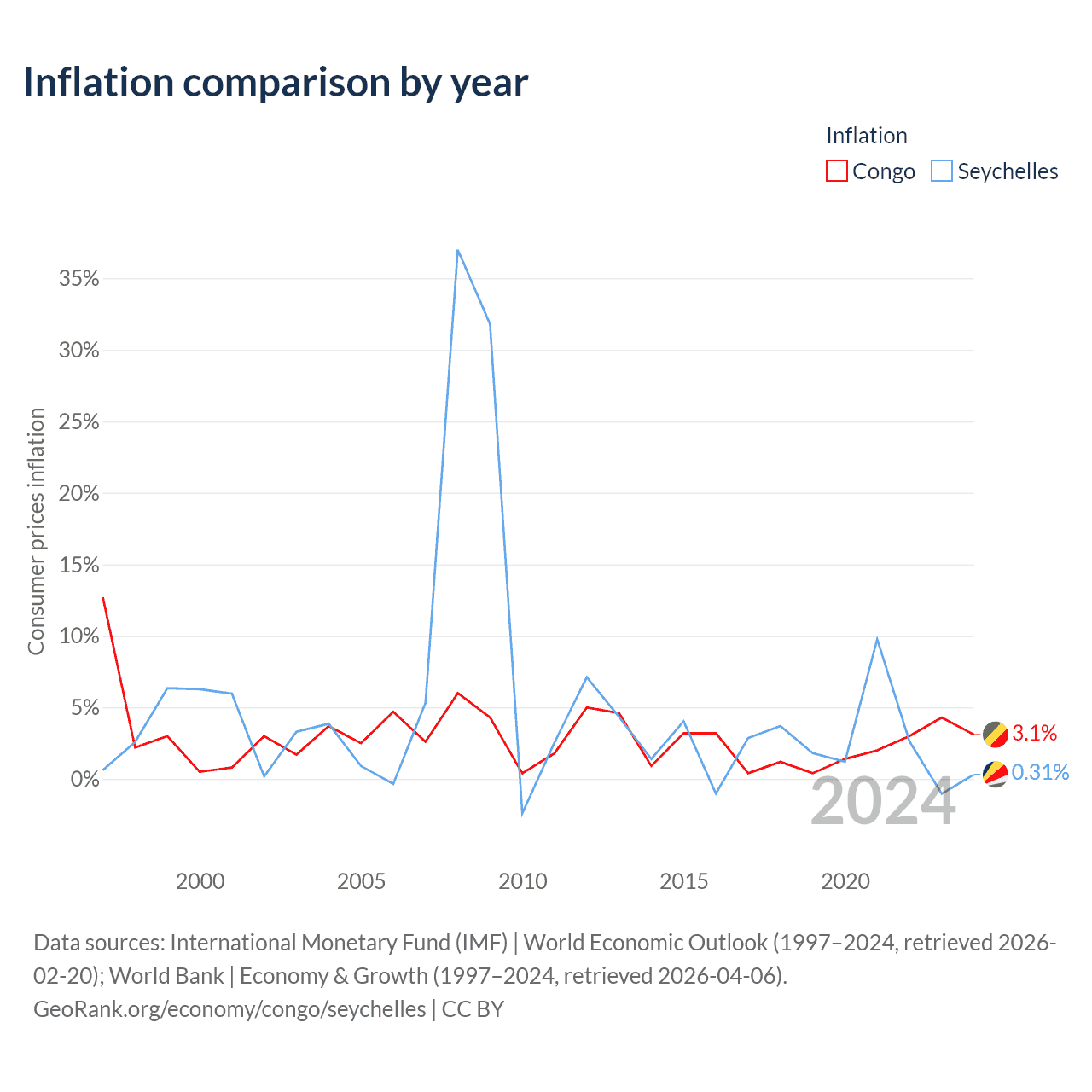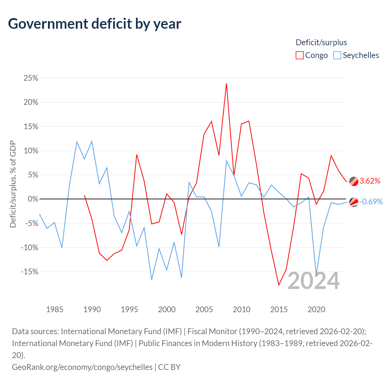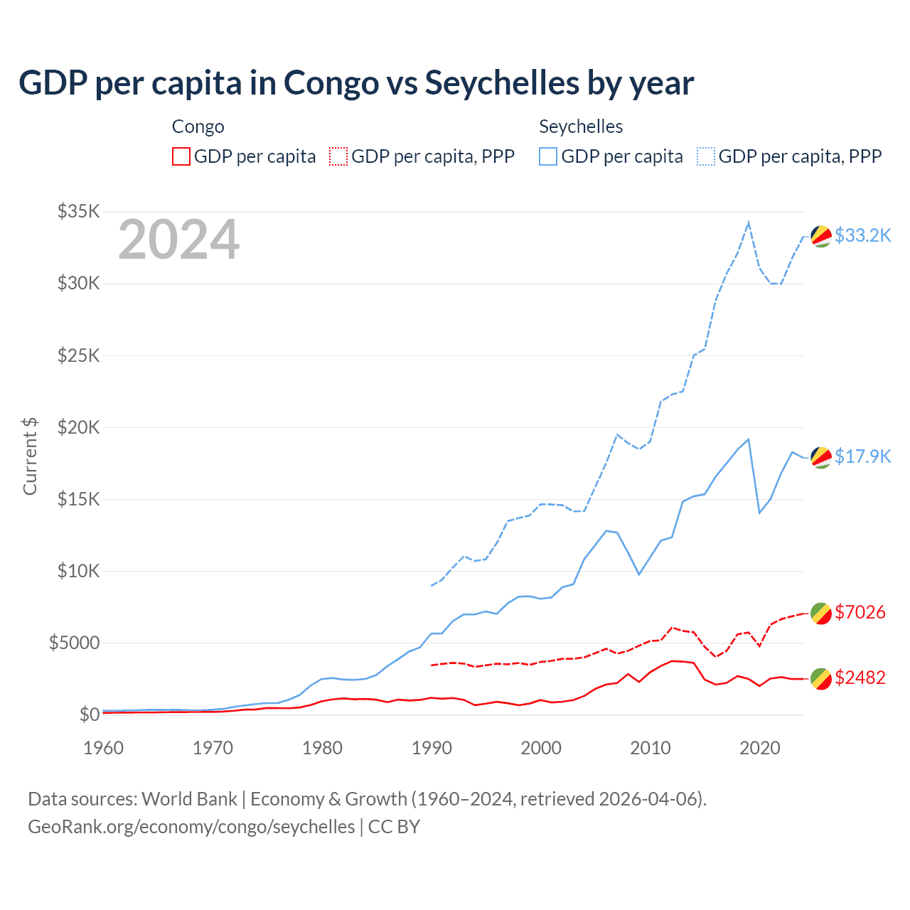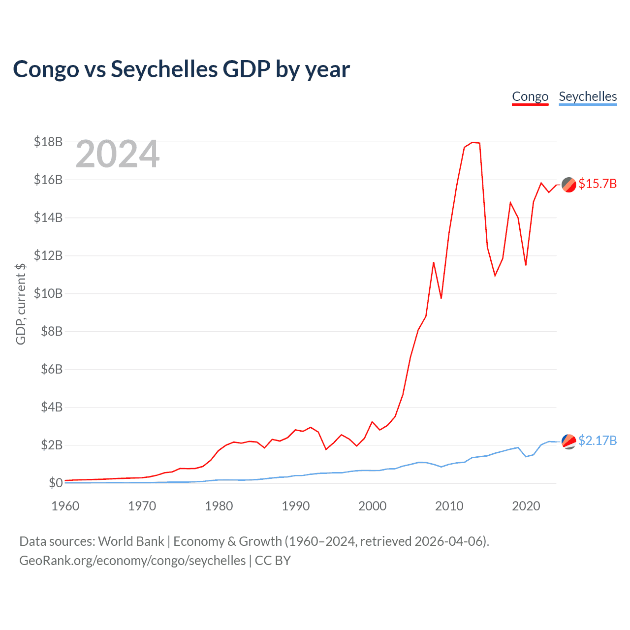 The Congo has a GDP of $15.7B compared to $2.17B for the Seychelles, ranking 141/197 and 178/197 by economy size, respectively.