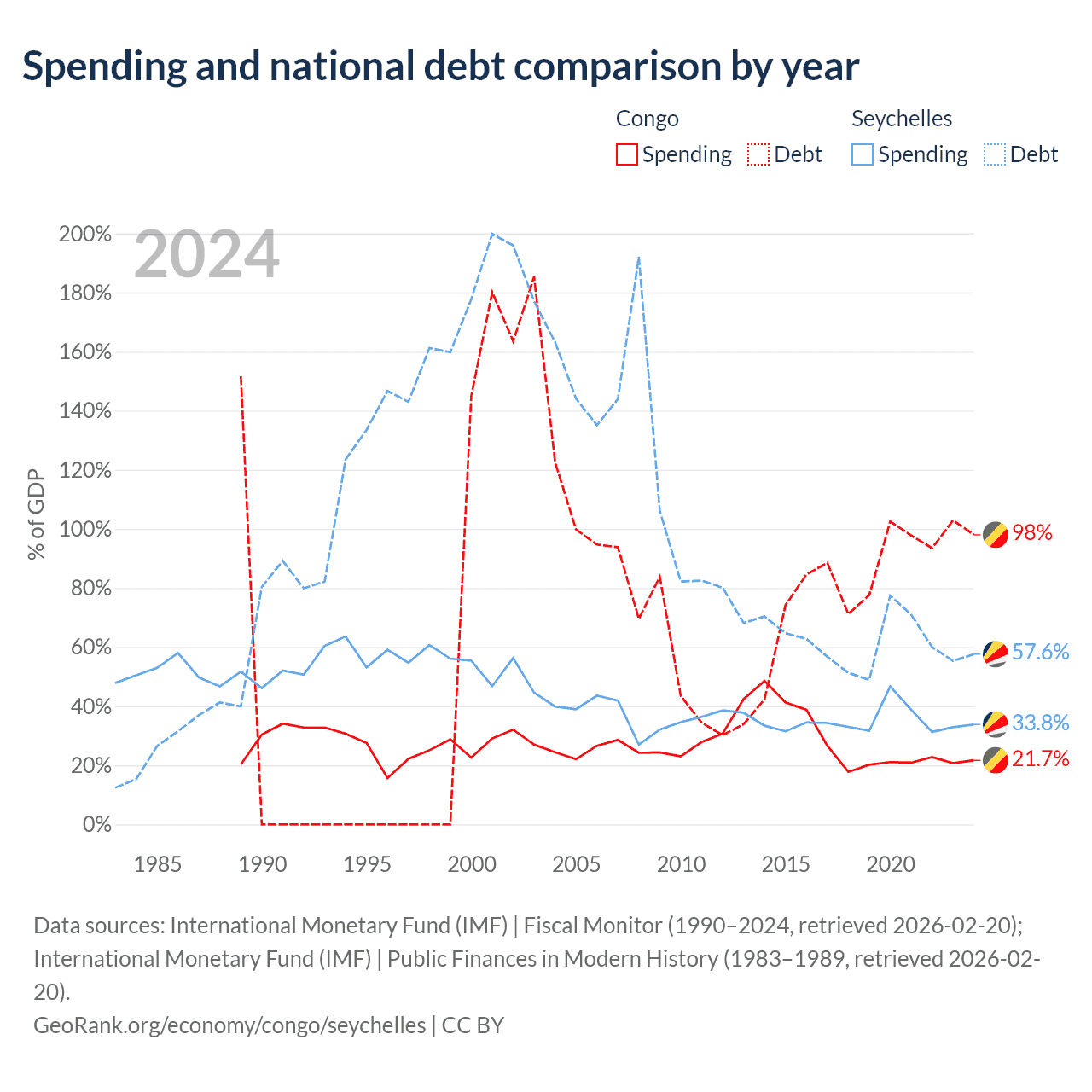 The Congo has $15.4B in government debt (98% of GDP), compared to $1.25B (57.6% of GDP) in the Seychelles.