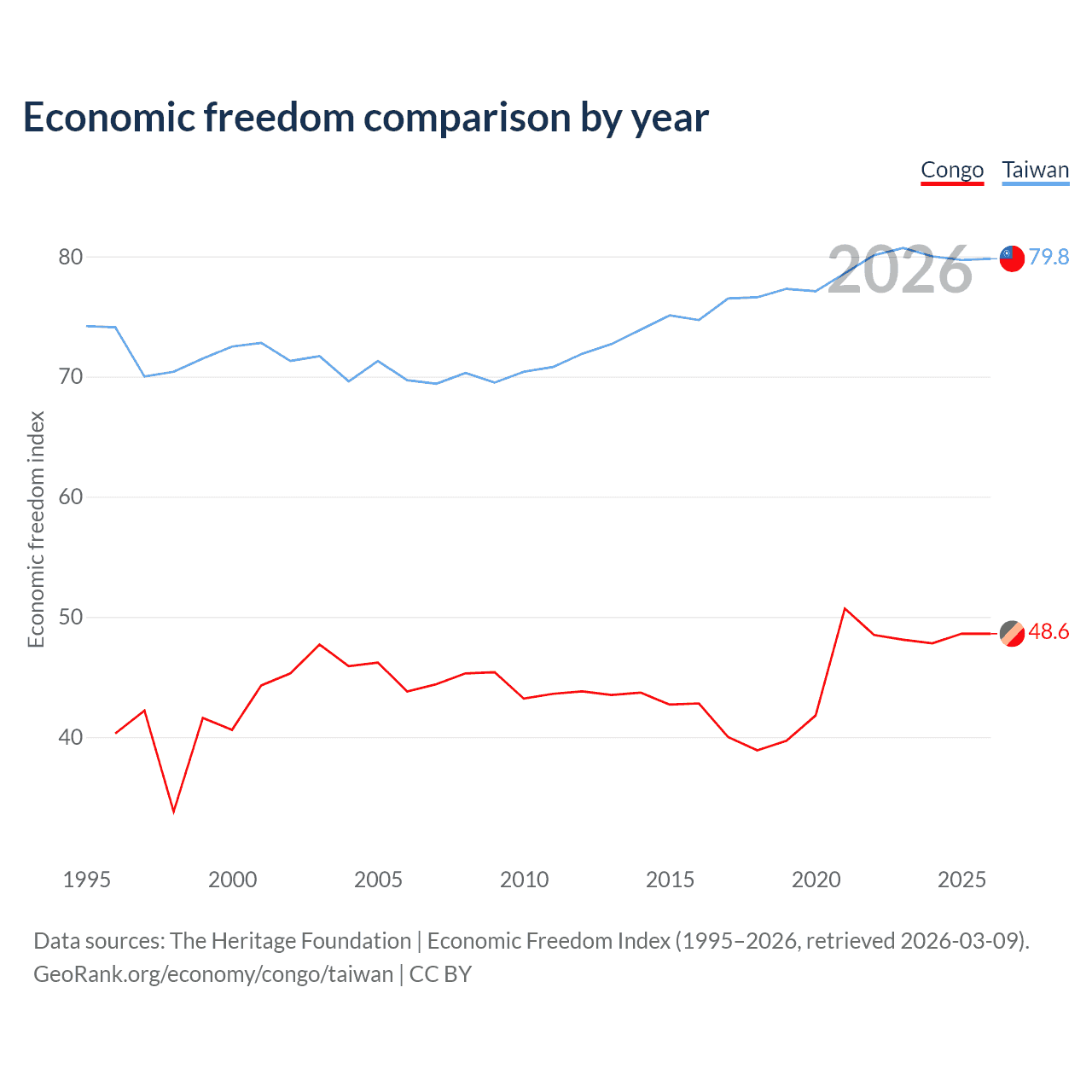 The Economic Freedom Index for the Congo is 48.6, ranking 169/197, compared to 79.8 for Taiwan, ranking 6/197. The chart above displays a comparison of annual changes in economic freedom indexes.