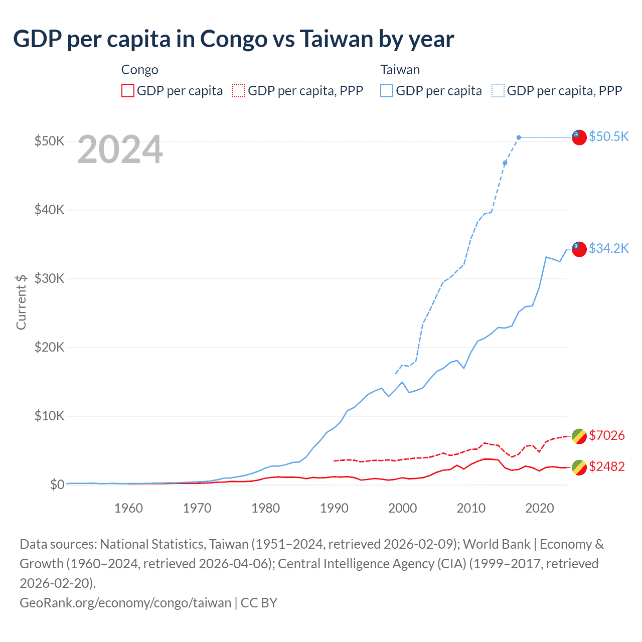 GDP per capita in Congo vs Taiwan by year