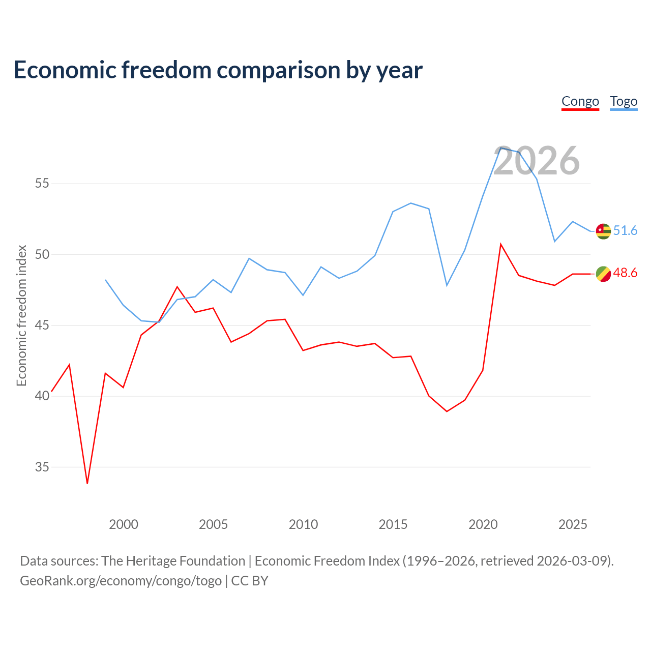 The Economic Freedom Index for the Congo is 48.6, ranking 169/197, compared to 51.6 for Togo, ranking 153/197. The chart above displays a comparison of annual changes in economic freedom indexes.