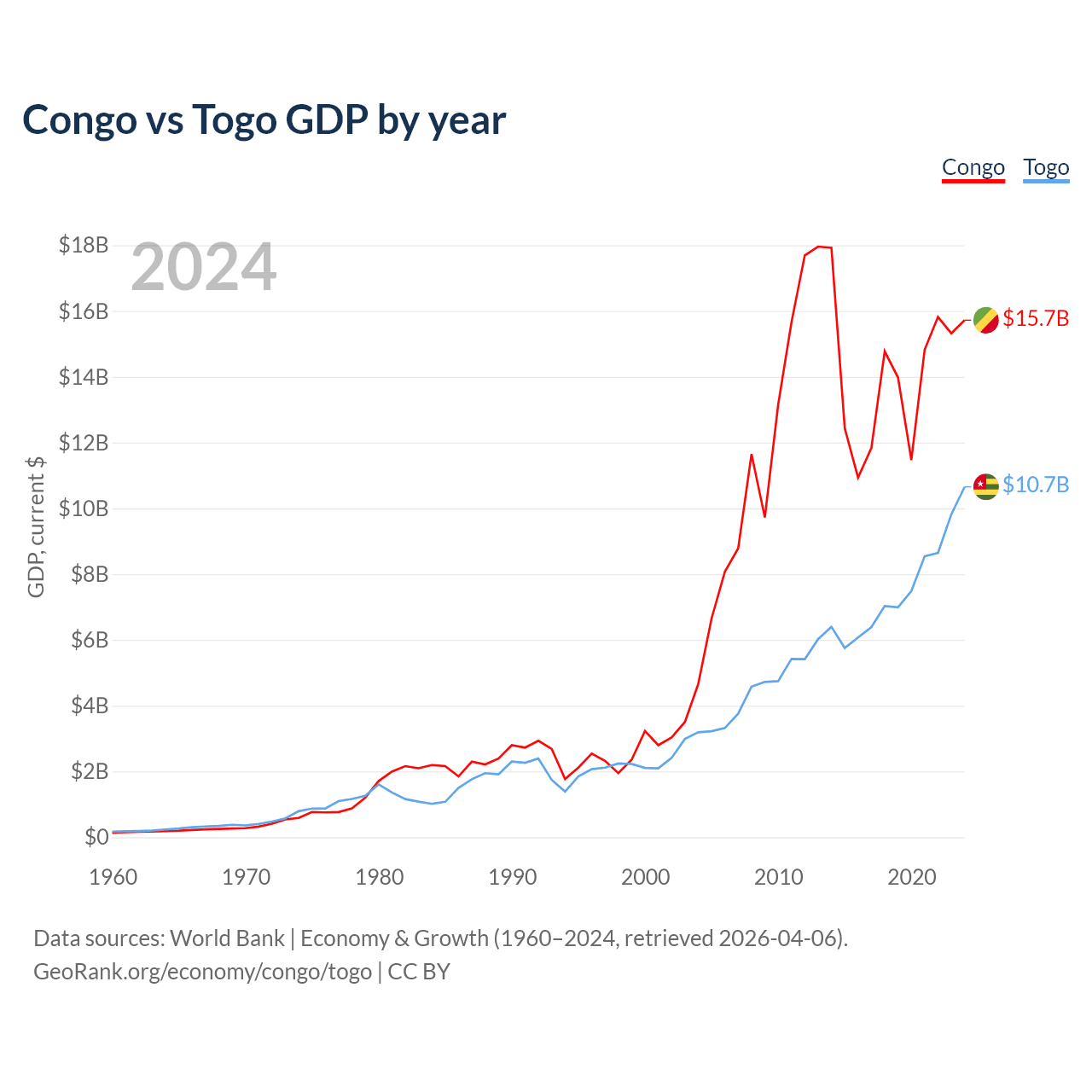 The Congo has a GDP of $15.7B compared to $10.7B for Togo, ranking 141/197 and 154/197 by economy size, respectively.