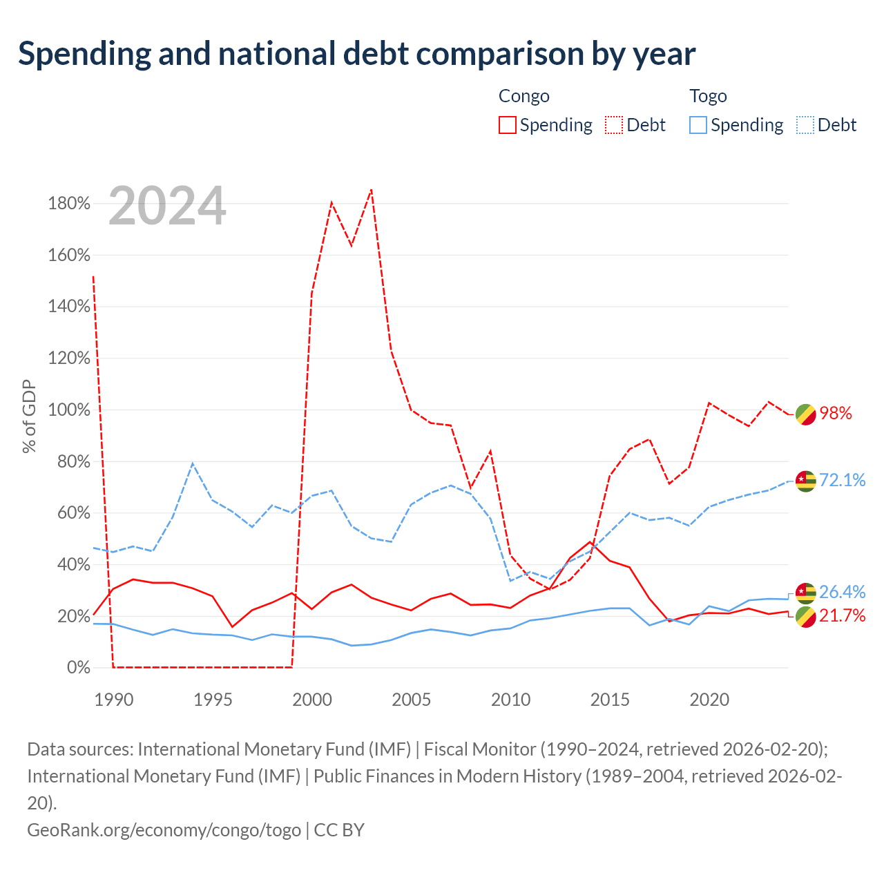 The Congo has $15.4B in government debt (98% of GDP), compared to $7.68B (72.1% of GDP) in Togo.