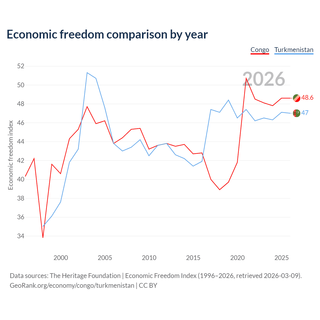 The Economic Freedom Index for the Congo is 48.6, ranking 169/197, compared to 47 for Turkmenistan, ranking 177/197. The chart above displays a comparison of annual changes in economic freedom indexes.