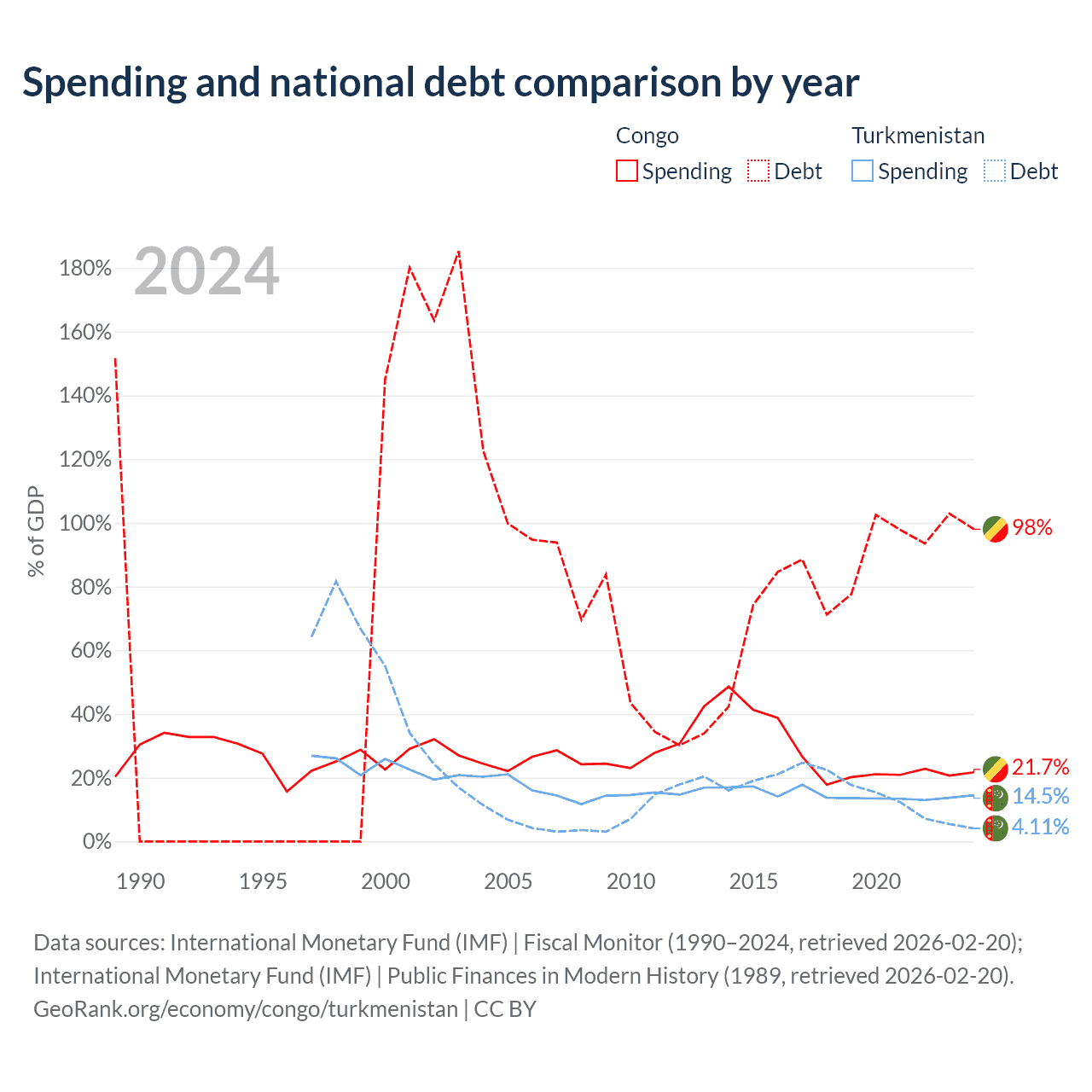 The Congo has $15.4B in government debt (98% of GDP), compared to $2.11B (4.11% of GDP) in Turkmenistan.