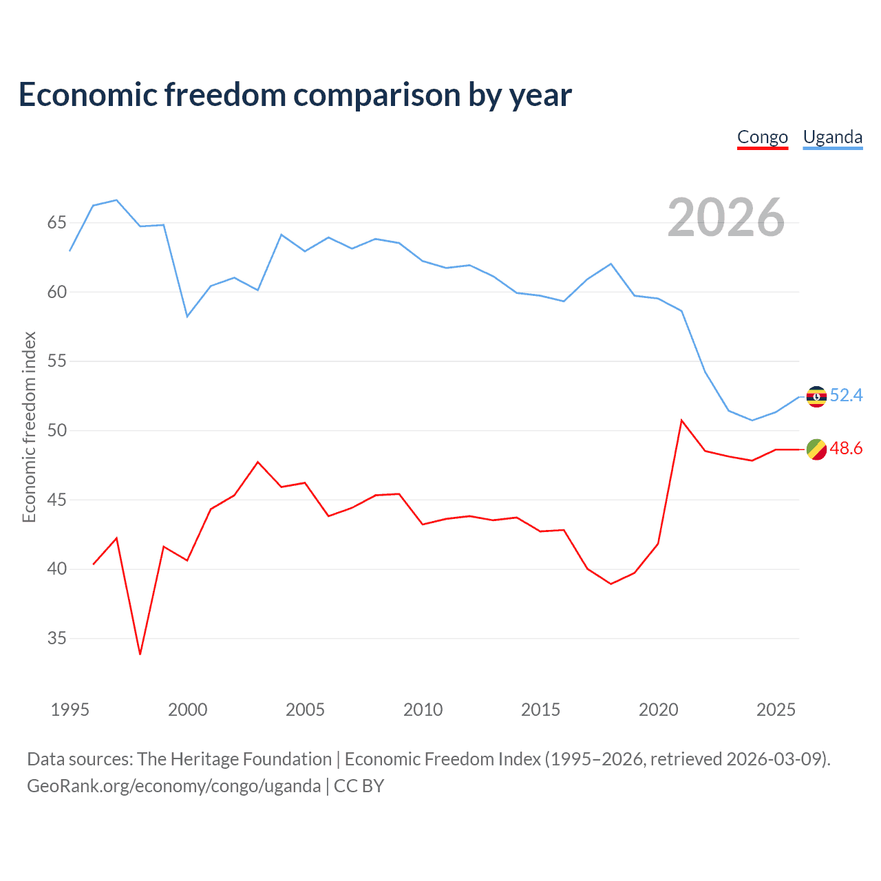 The Economic Freedom Index for the Congo is 48.6, ranking 169/197, compared to 52.4 for Uganda, ranking 149/197. The chart above displays a comparison of annual changes in economic freedom indexes.