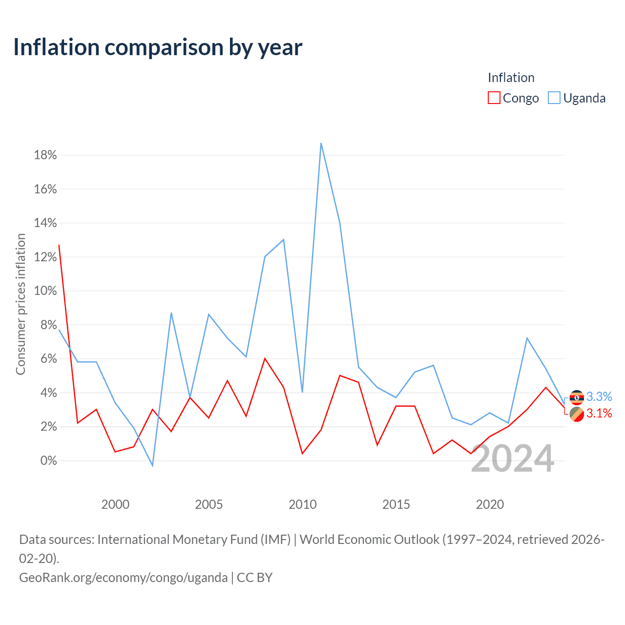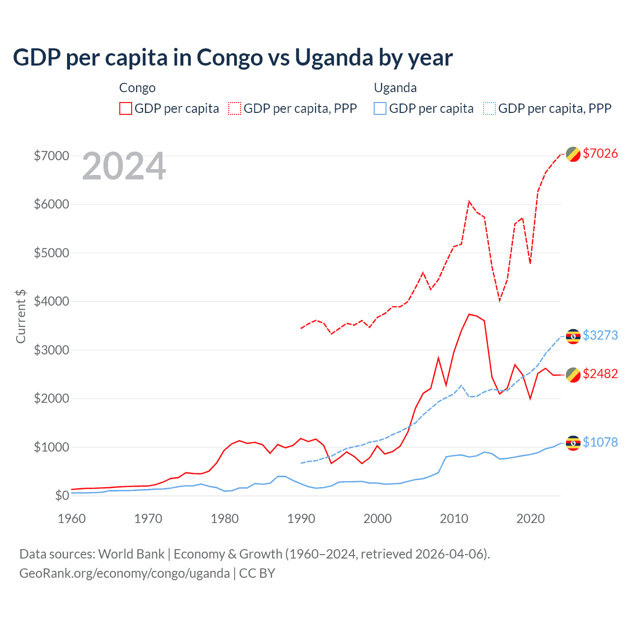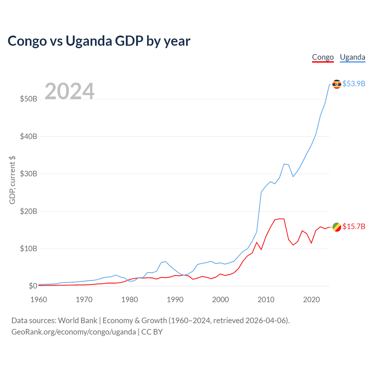 The Congo has a GDP of $15.7B compared to $53.9B for Uganda, ranking 141/197 and 89/197 by economy size, respectively.