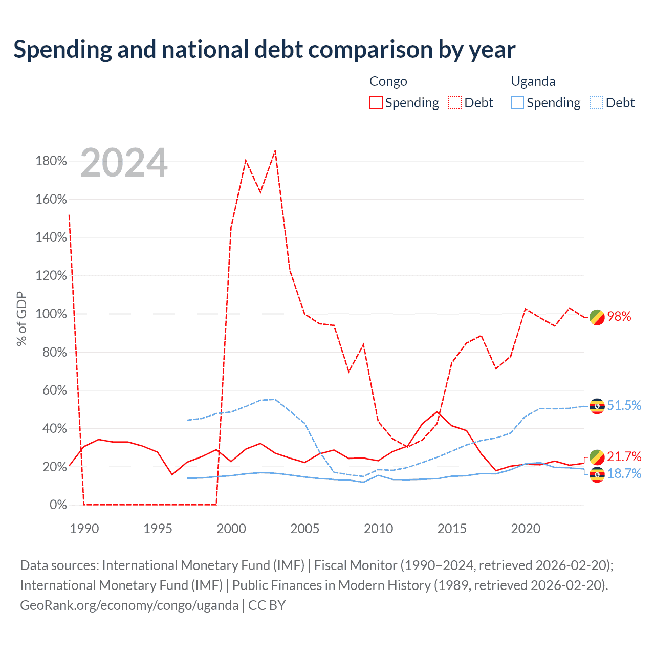 The Congo has $15.4B in government debt (98% of GDP), compared to $27.8B (51.5% of GDP) in Uganda.