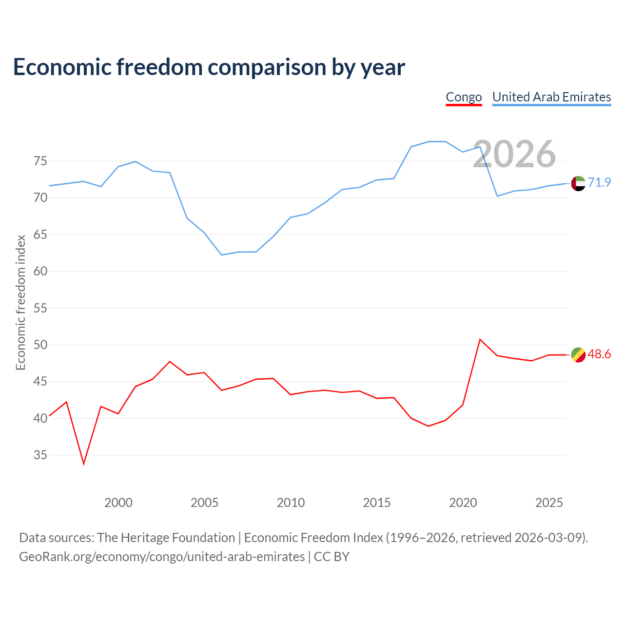 The Economic Freedom Index for the Congo is 48.6, ranking 169/197, compared to 71.9 for the United Arab Emirates, ranking 29/197. The chart above displays a comparison of annual changes in economic freedom indexes.