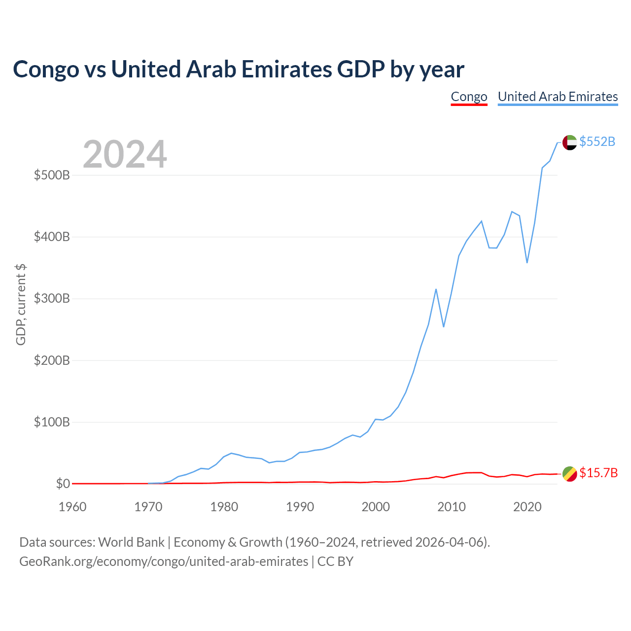 The Congo has a GDP of $15.7B compared to $552B for the United Arab Emirates, ranking 141/197 and 27/197 by economy size, respectively.