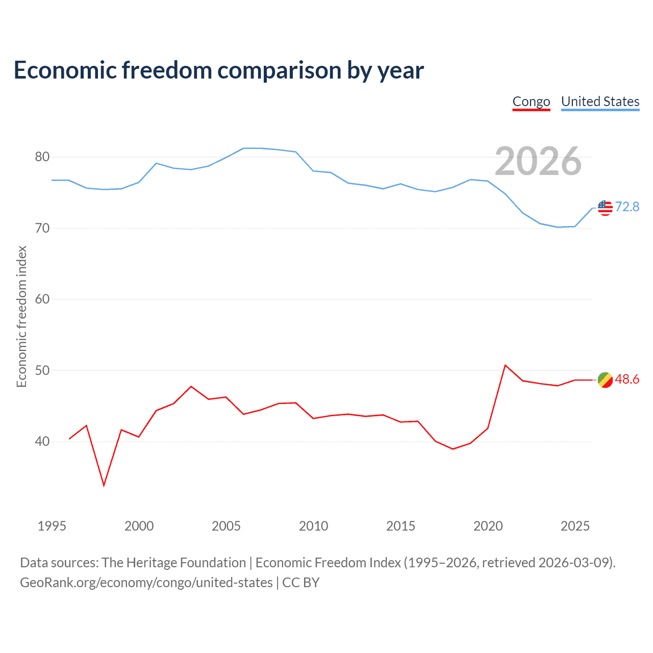 The Economic Freedom Index for the Congo is 48.6, ranking 169/197, compared to 72.8 for the United States, ranking 27/197. The chart above displays a comparison of annual changes in economic freedom indexes.
