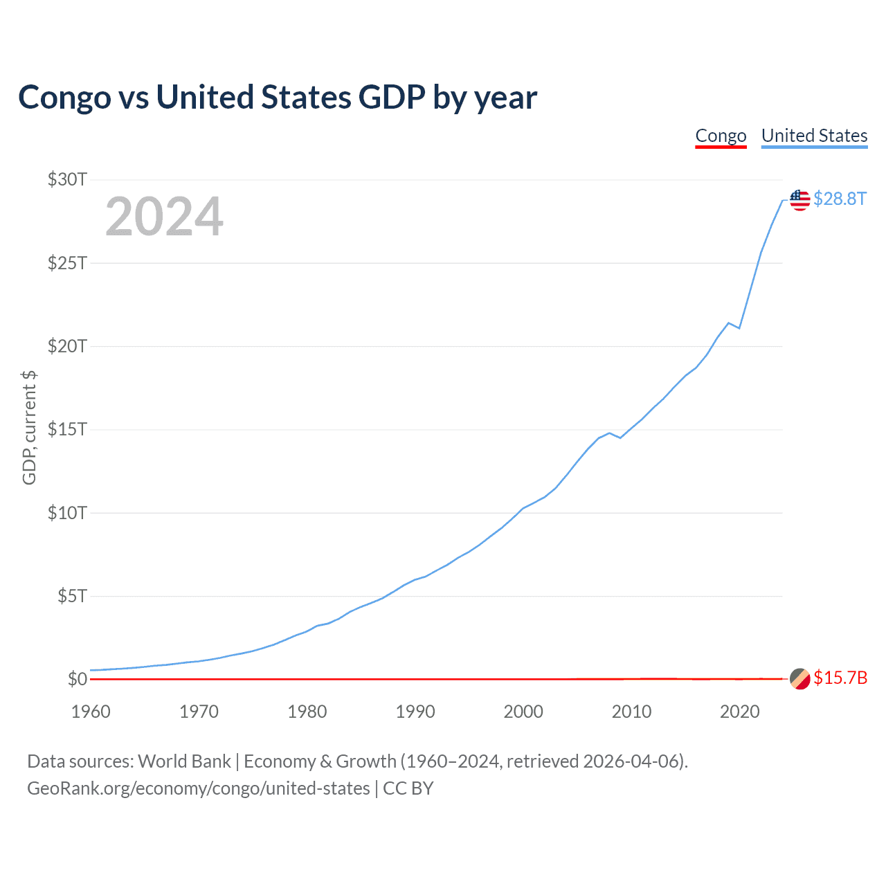 The Congo has a GDP of $15.7B compared to $28.8T for the United States, ranking 141/197 and 1/197 by economy size, respectively.