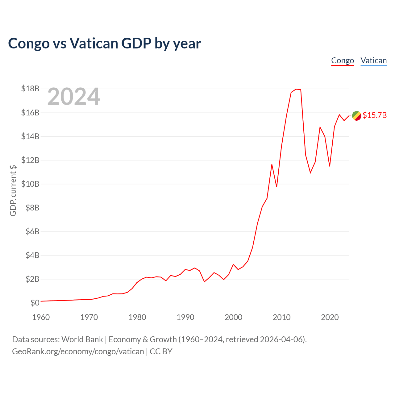 The Congo has a GDP of $15.7B compared to $19.8M for the Vatican, ranking 141/197 and 197/197 by economy size, respectively.
