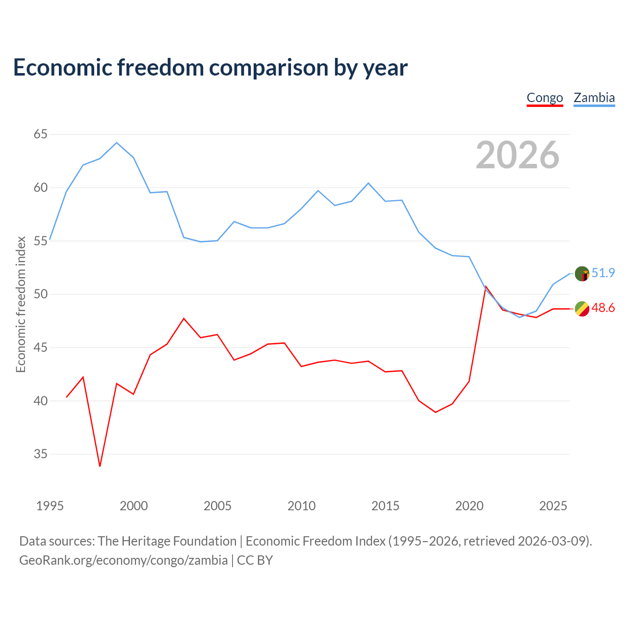 The Economic Freedom Index for the Congo is 48.6, ranking 169/197, compared to 51.9 for Zambia, ranking 152/197. The chart above displays a comparison of annual changes in economic freedom indexes.
