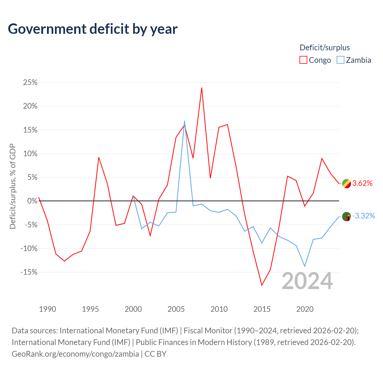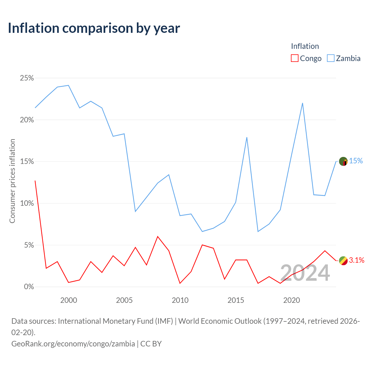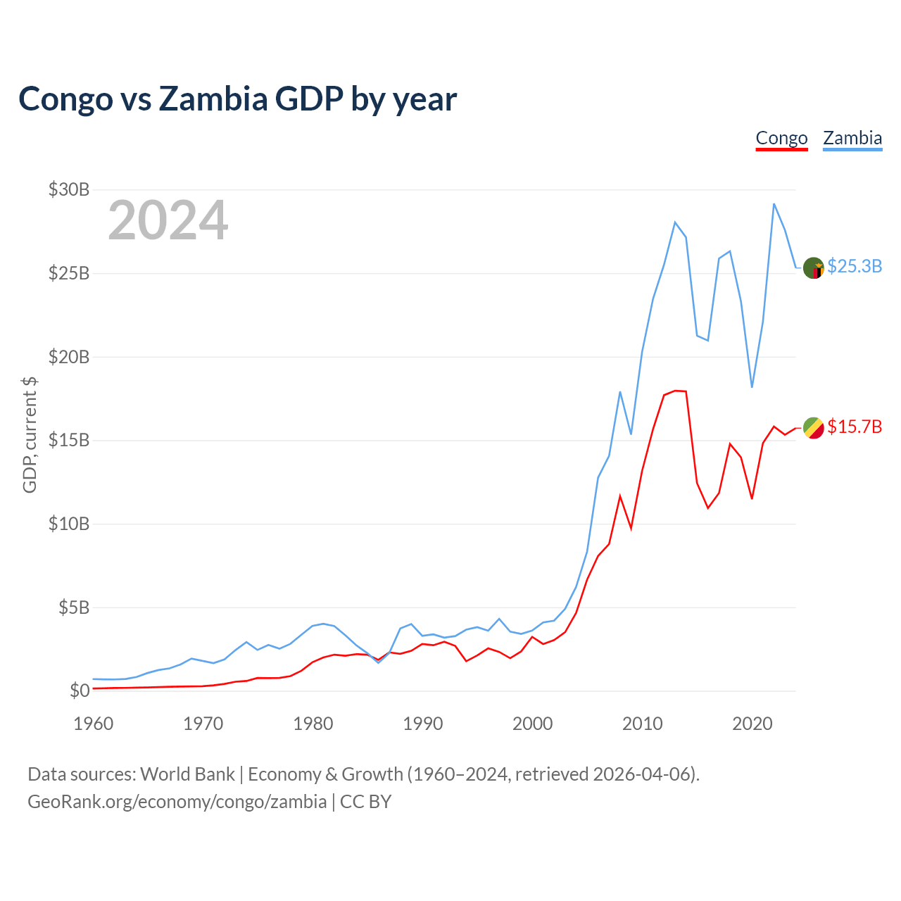 The Congo has a GDP of $15.7B compared to $25.3B for Zambia, ranking 141/197 and 116/197 by economy size, respectively.