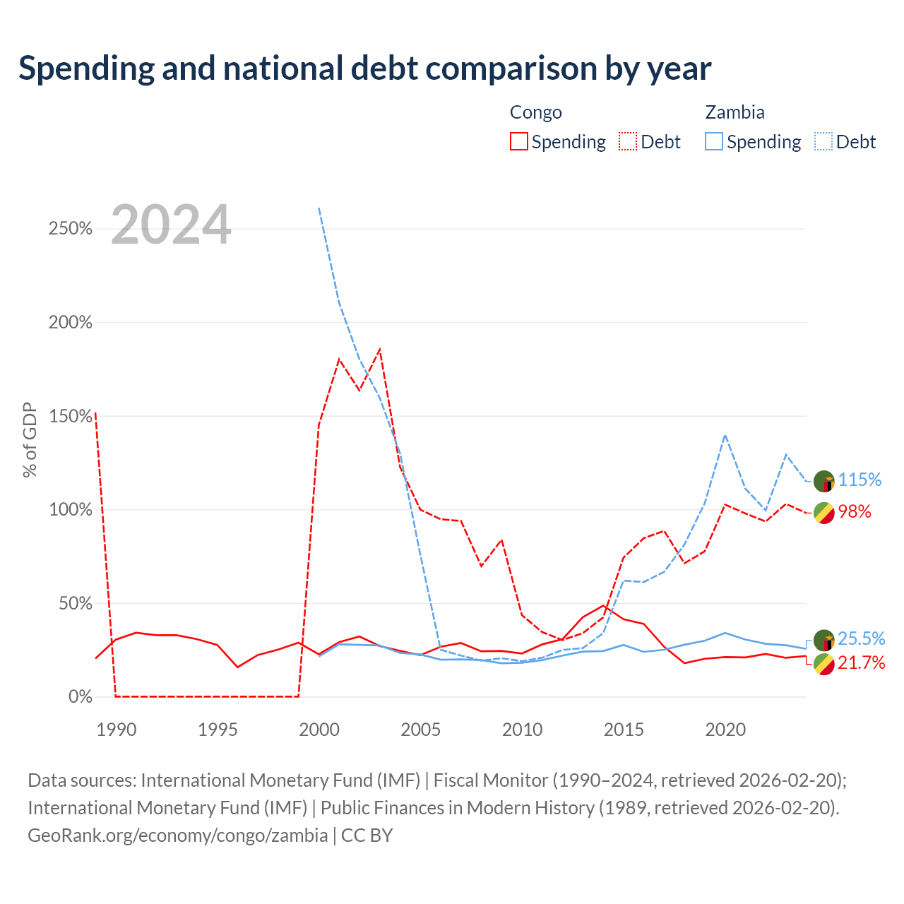The Congo has $15.4B in government debt (98% of GDP), compared to $29.1B (114.9% of GDP) in Zambia.