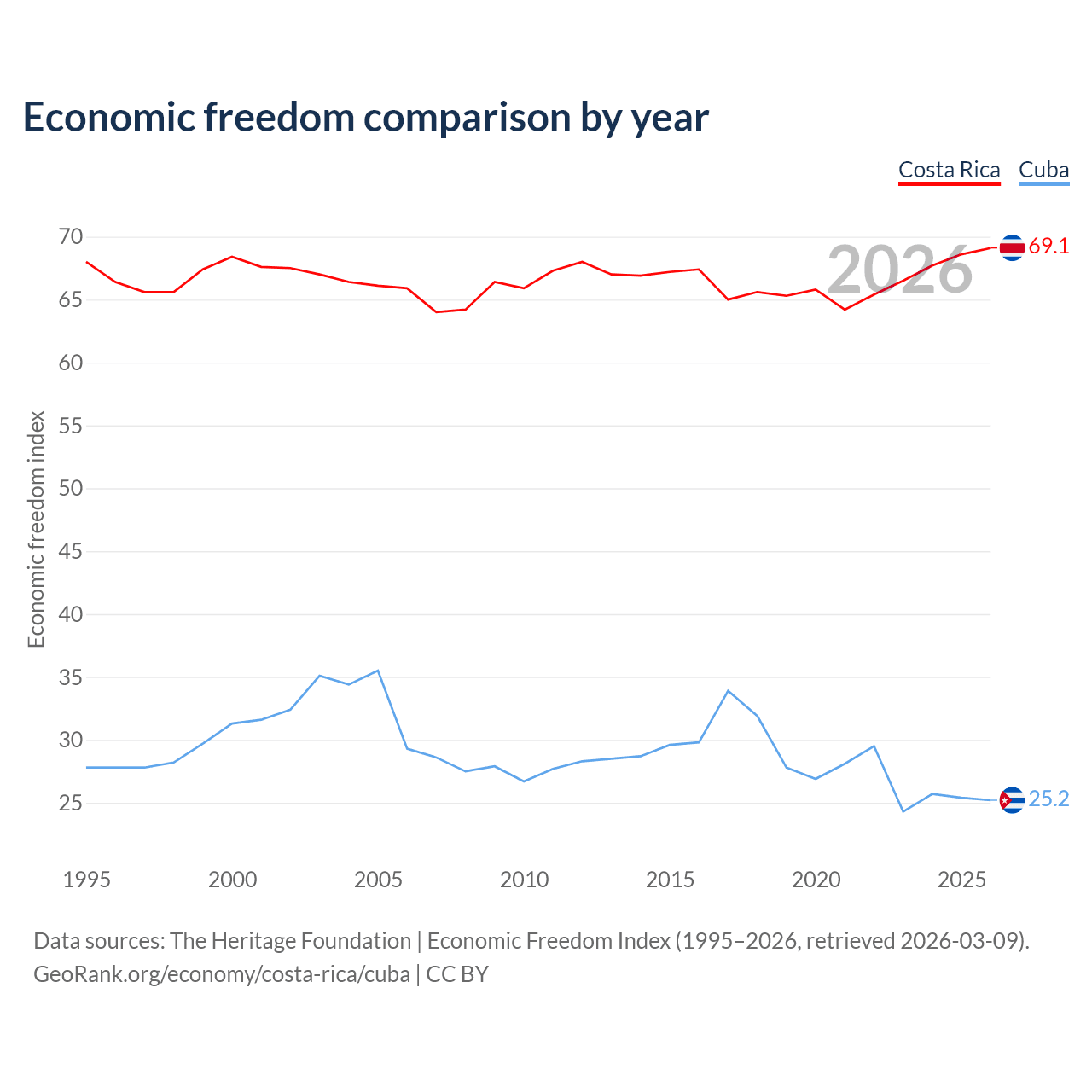 The Economic Freedom Index for Costa Rica is 69.1, ranking 43/197, compared to 25.2 for Cuba, ranking 195/197. The chart above displays a comparison of annual changes in economic freedom indexes.