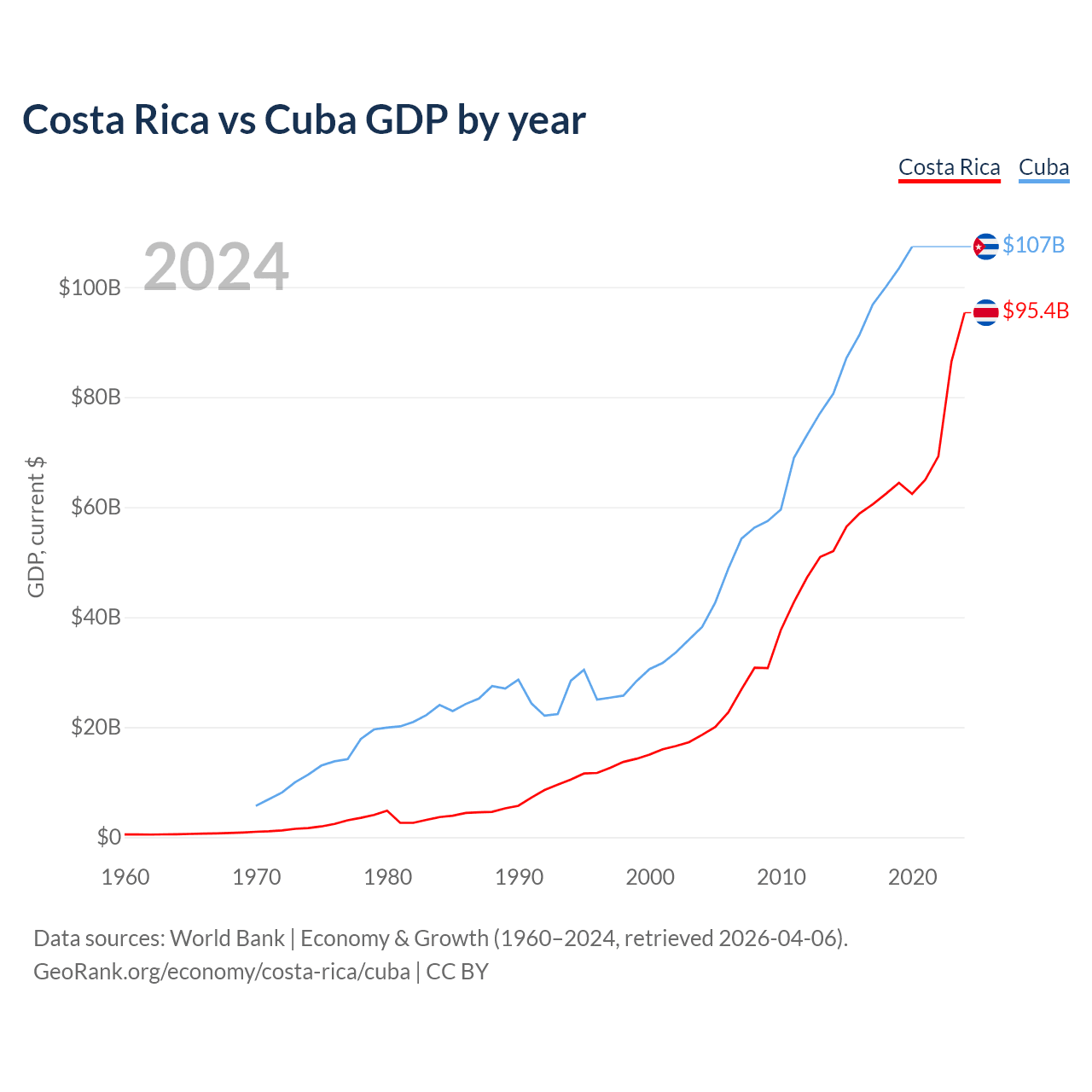 Costa Rica has a GDP of $95.4B compared to $107B for Cuba, ranking 73/197 and 69/197 by economy size, respectively.
